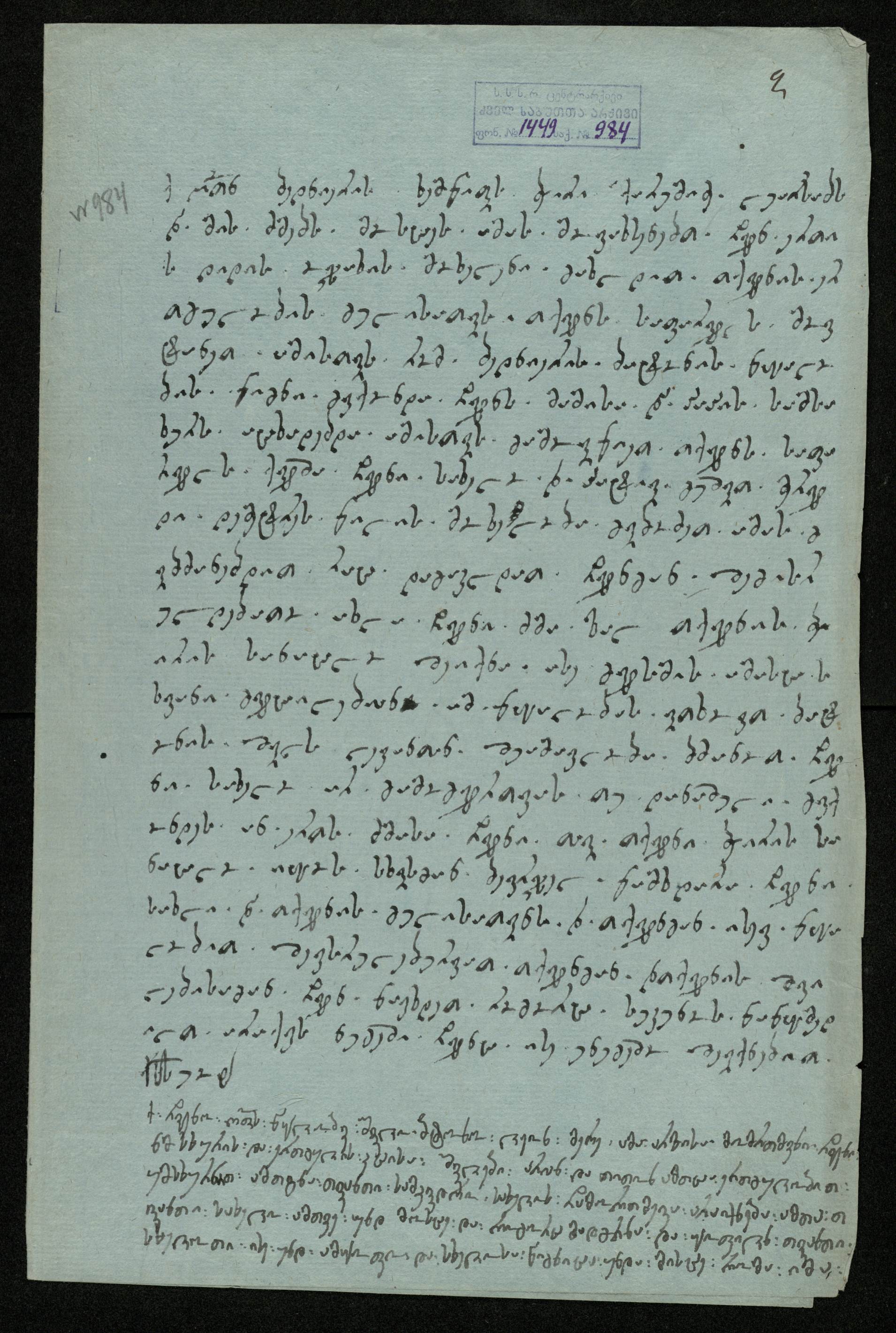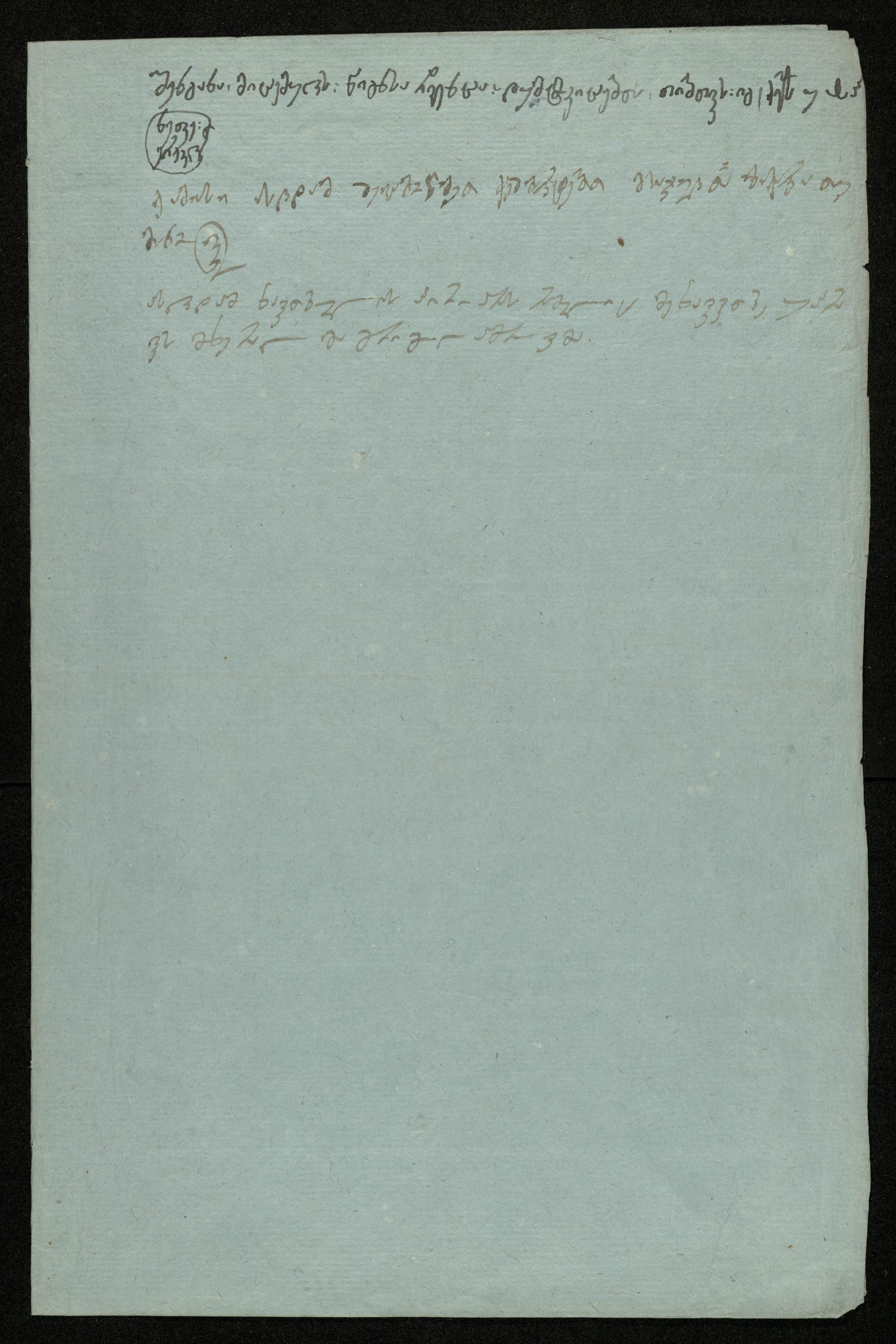 ჭვირნიშნიანი ქაღალდი ცისფერი, დაწერილი შავი მელნით.