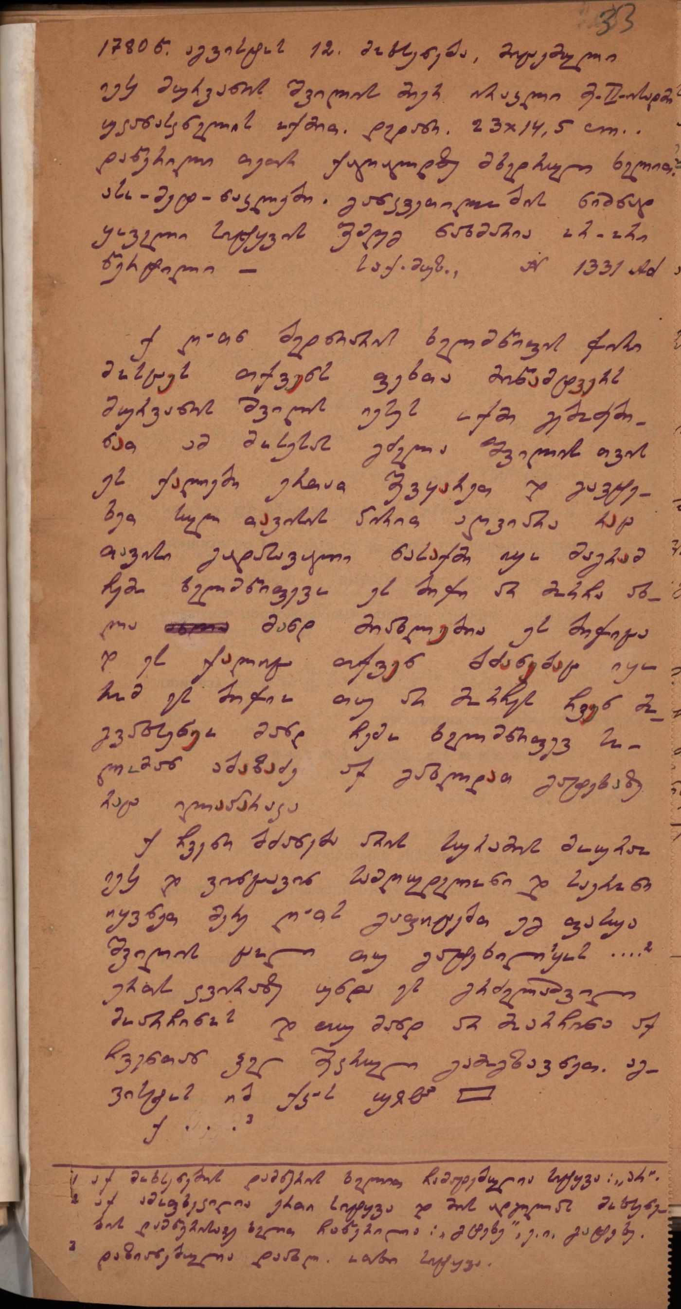 2. დედნის აღწერა გიორგი ბოჭორიძის მიერ: ,,დედანი, 23X14,5 CM..დაწერილითეთრ ქაღალდზე მხედრული ხელით; განკვეთილობის ნიშნად ყოველი სიტყვის შემდეგ ნახმარია ორ-ორი წერტილი".