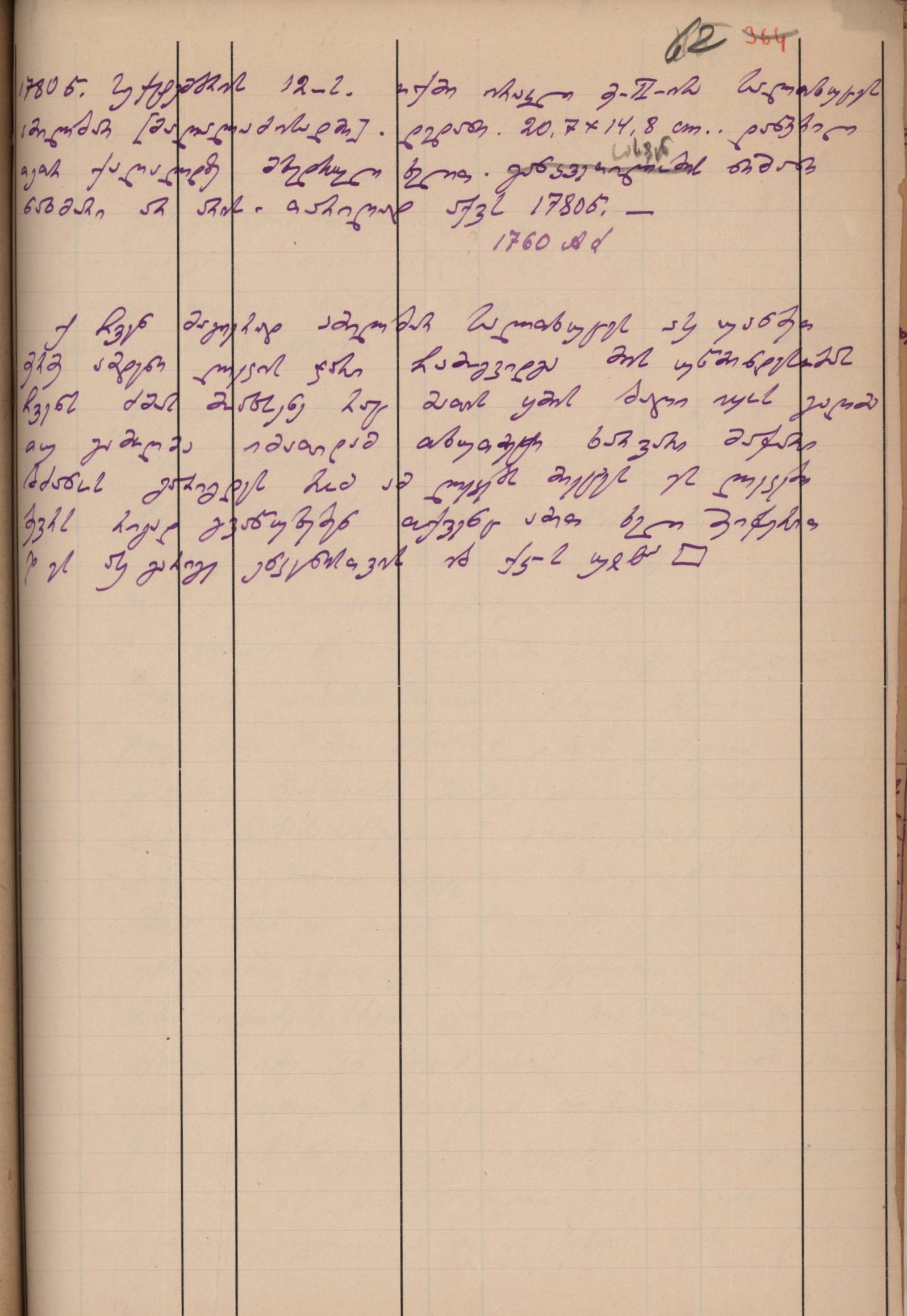 2. დედნის აღწერა გიორგი ბოჭორიძის მიერ: ,,დედანი, 20,7x14, 2 cm.. დაწერილი თეთრ ქაღალდზე მხედრული ხელით; განკვეთილობის ნიშანი ნახმარი არ არის", დედანი, ხეც, Ad 1760.