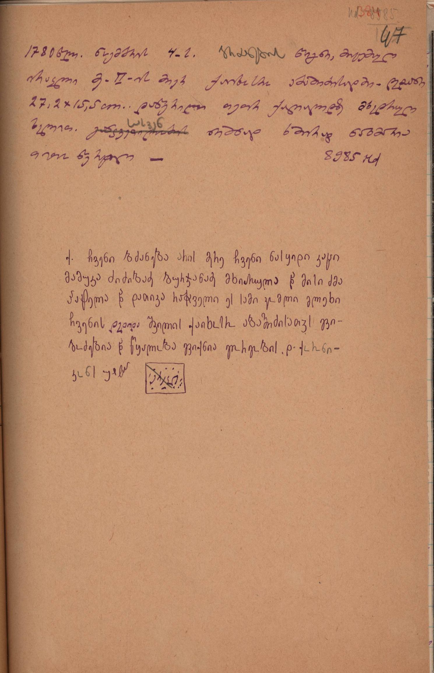 2. დედნის აღწერა გიორგი ბოჭორიძის მიერ: ,,დედანი, 27,2x15,5..cm დაწერილი თეთრ ქაღალდზე მხედრული ხელით. განკვეთილობის ნიშნად ხშირად ნახმარია თითო წერტილი".