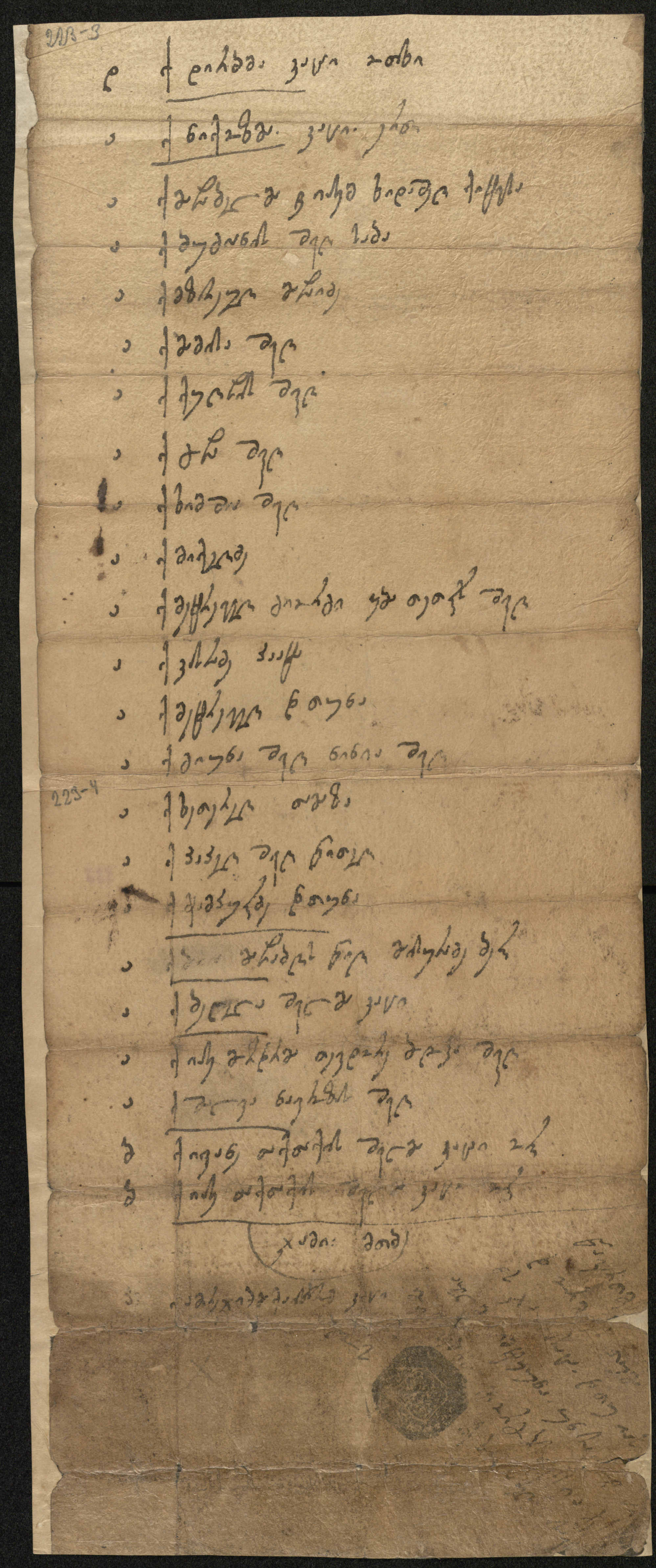 ქაღალდი ყავისფერი, დაწერილი შავი მელნით.