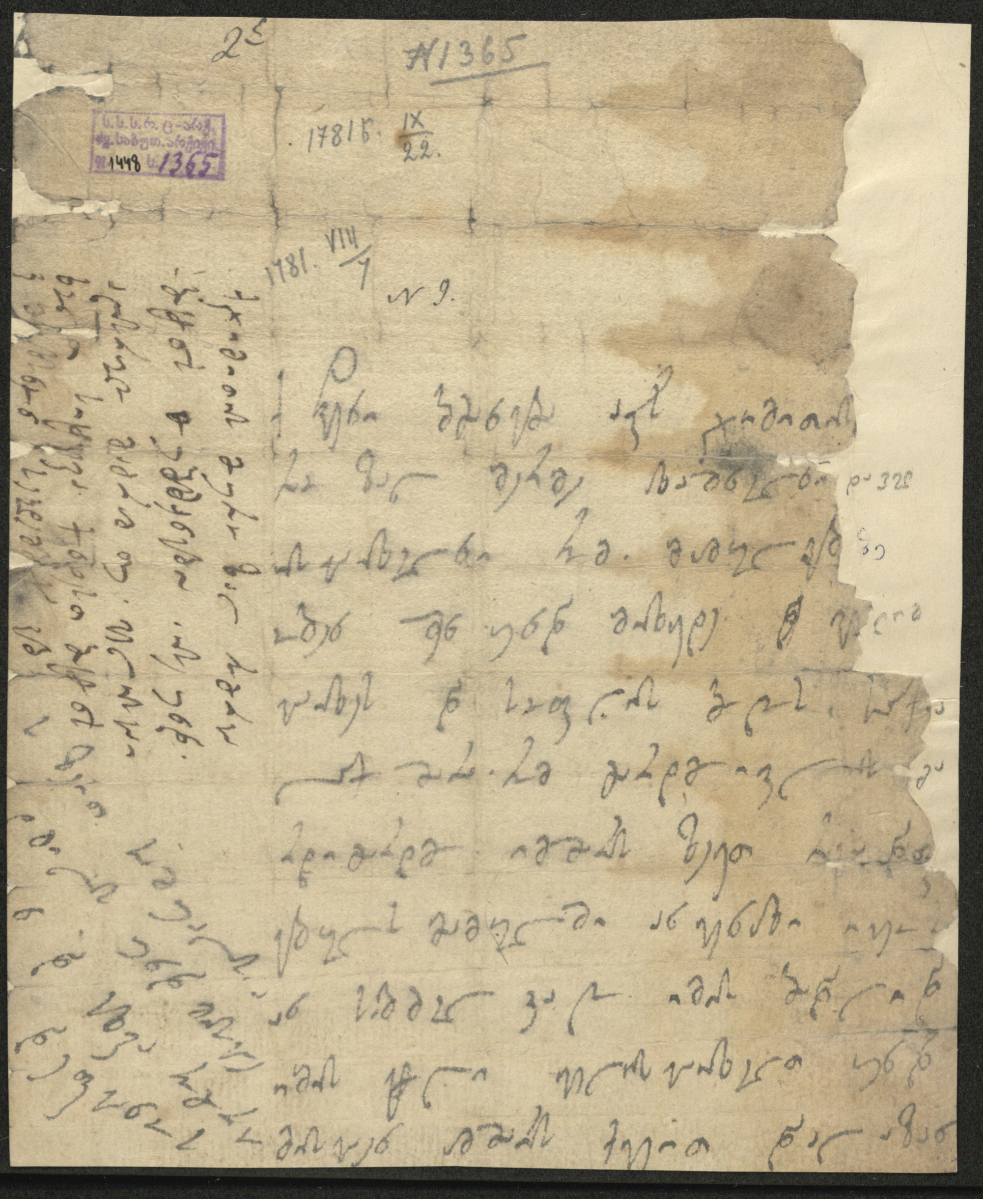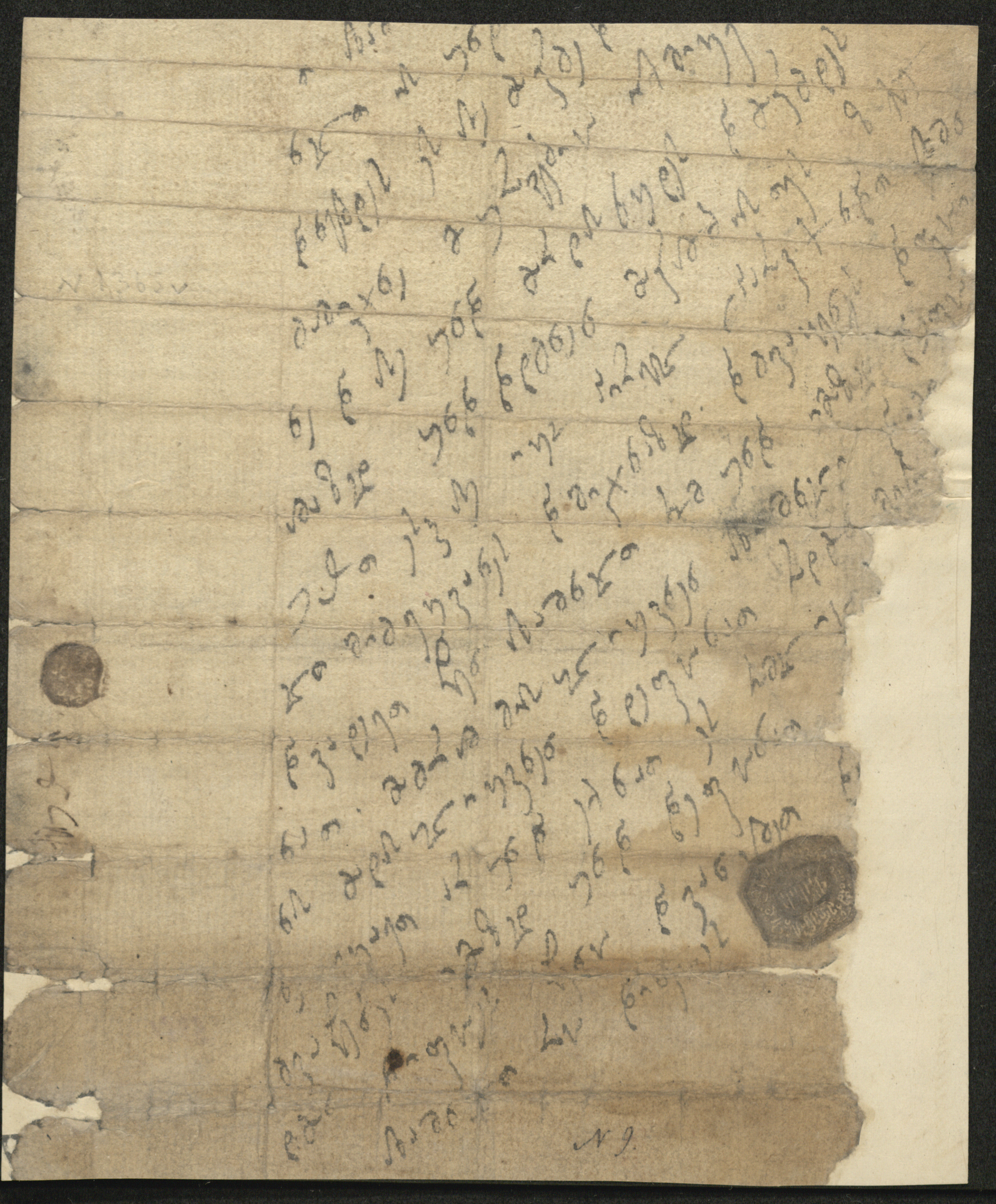 ქაღალდი მონაცრისფერო, დაწერილი შავი და ყავისფერი მელნით