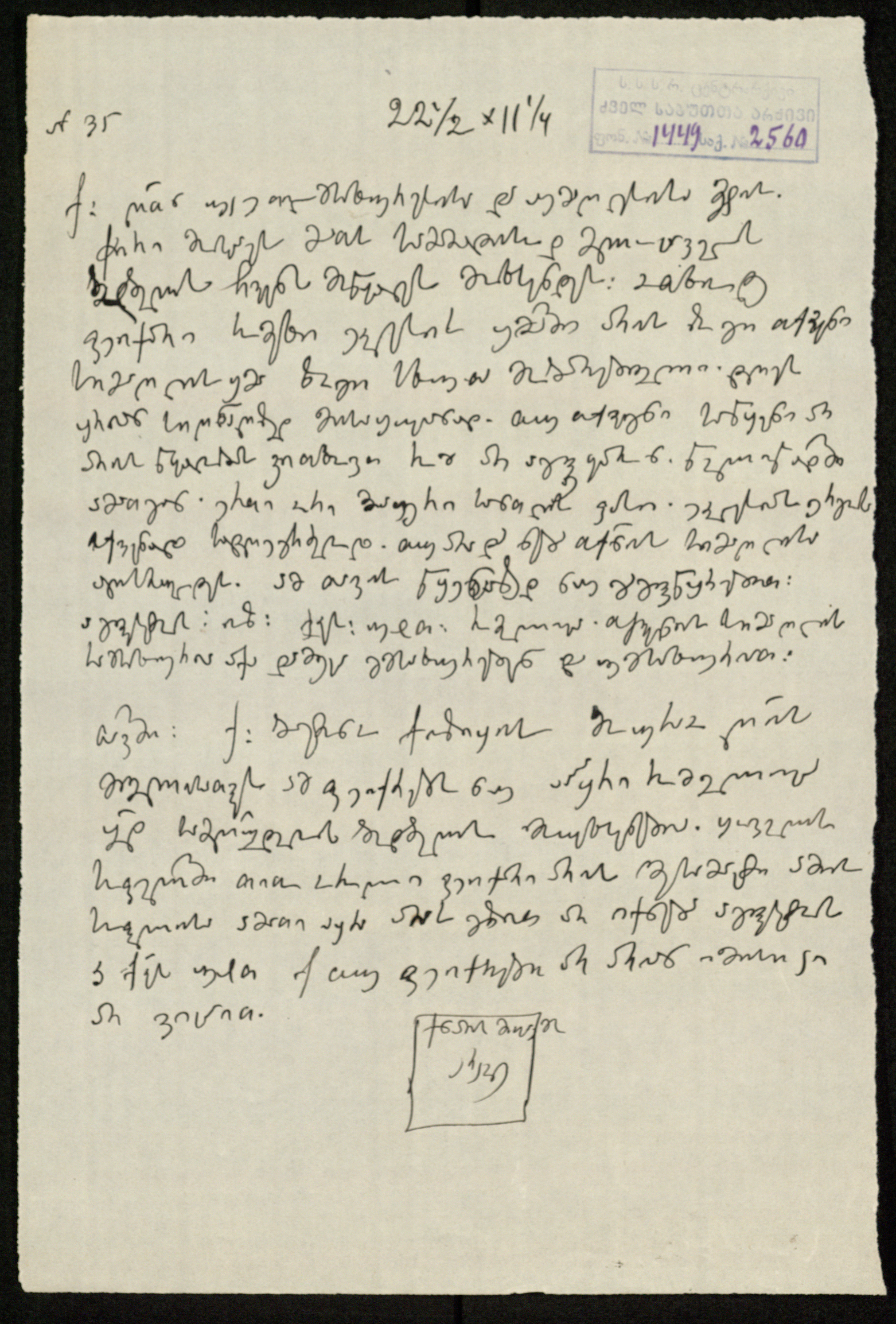 2. დედნის სარგის კაკაბაძისეული აღწერა:,,დედნის ზომა: 221/2X111/4; ძველი საარქივო-სააღრიცხვო ნომერი:N35.