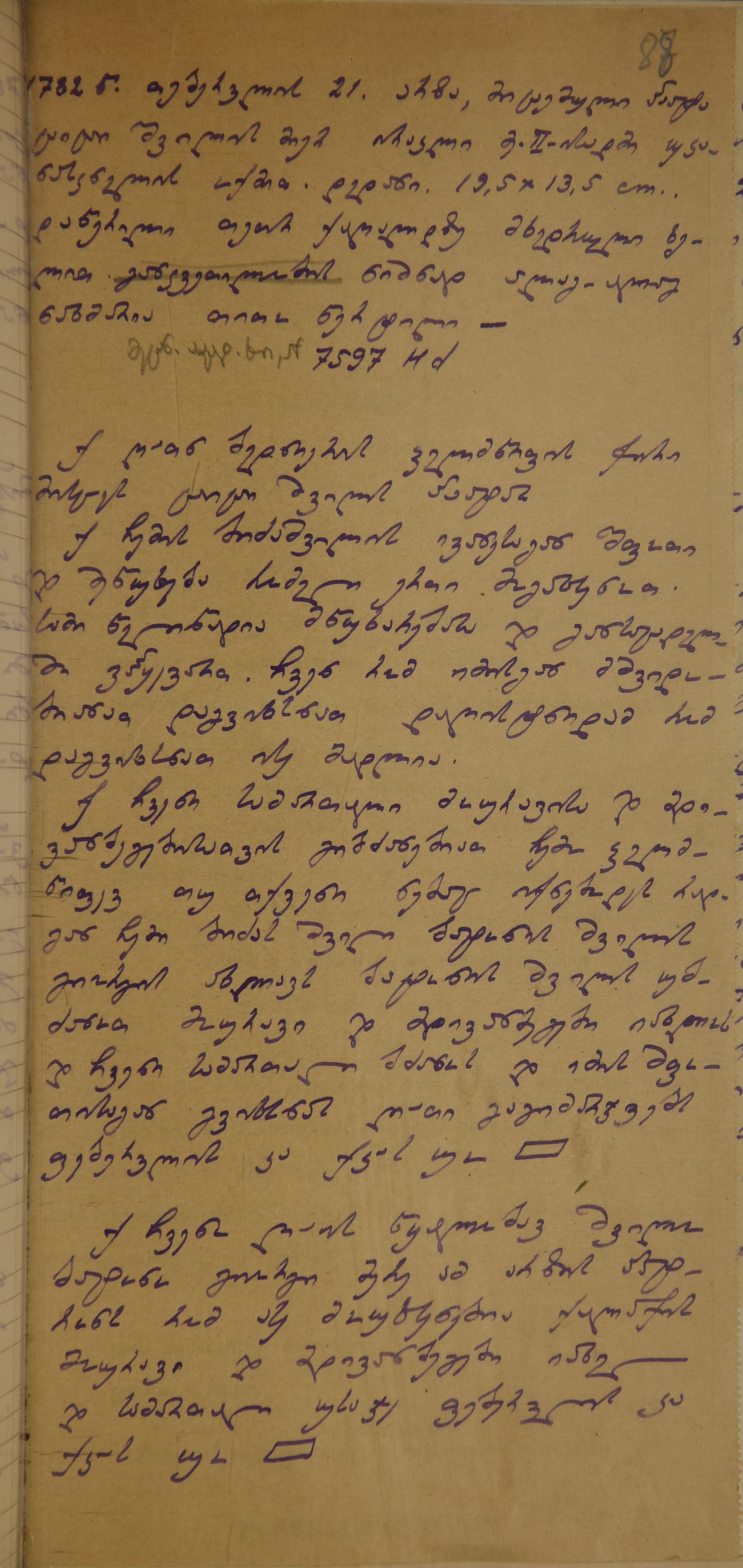 2. დედნის აღწერა გიორგი ბოჭორიძის მიერ: ,,დედანი, 19,5x13,5, cm.. დაწერილი თეთრ ქაღალდზე მხედრული ხელით, განკვეთილობის ნიშნად ალაგ-ალაგ ნახმარია თითო წერტილი".