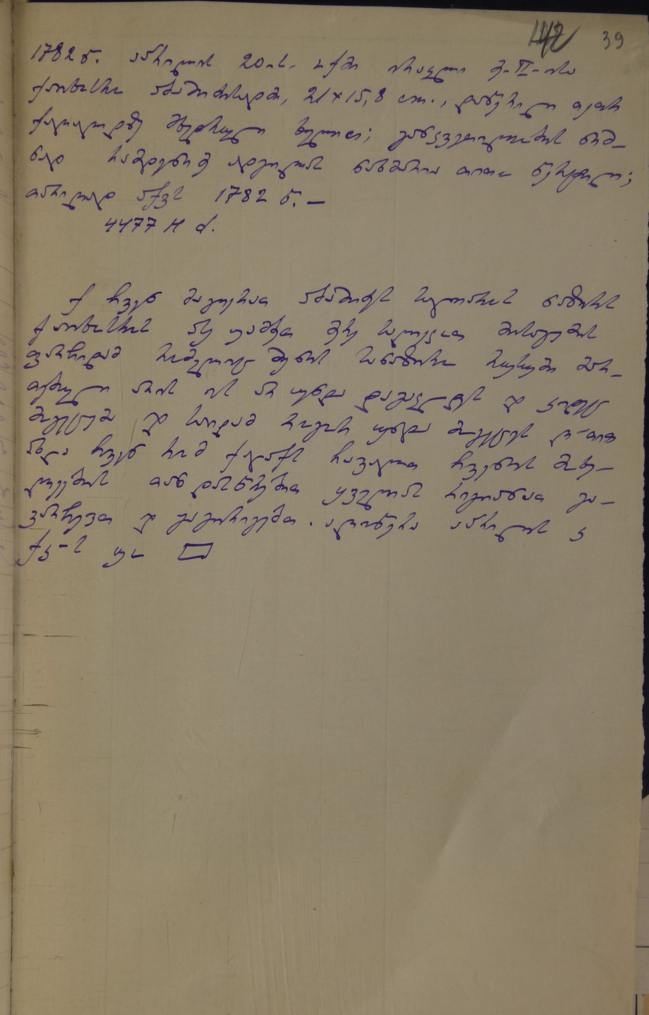 2. დედის აღწერა გიორგი ბოჭორიძის მიერ: ,,დედანი, 21X15,8 CM., დაწერილი ქაღალდზე მხედრული ხელით; განკვეთილობის ნიშნად რამდენიმე ადგილას ნახმარია თითო წერტილი".