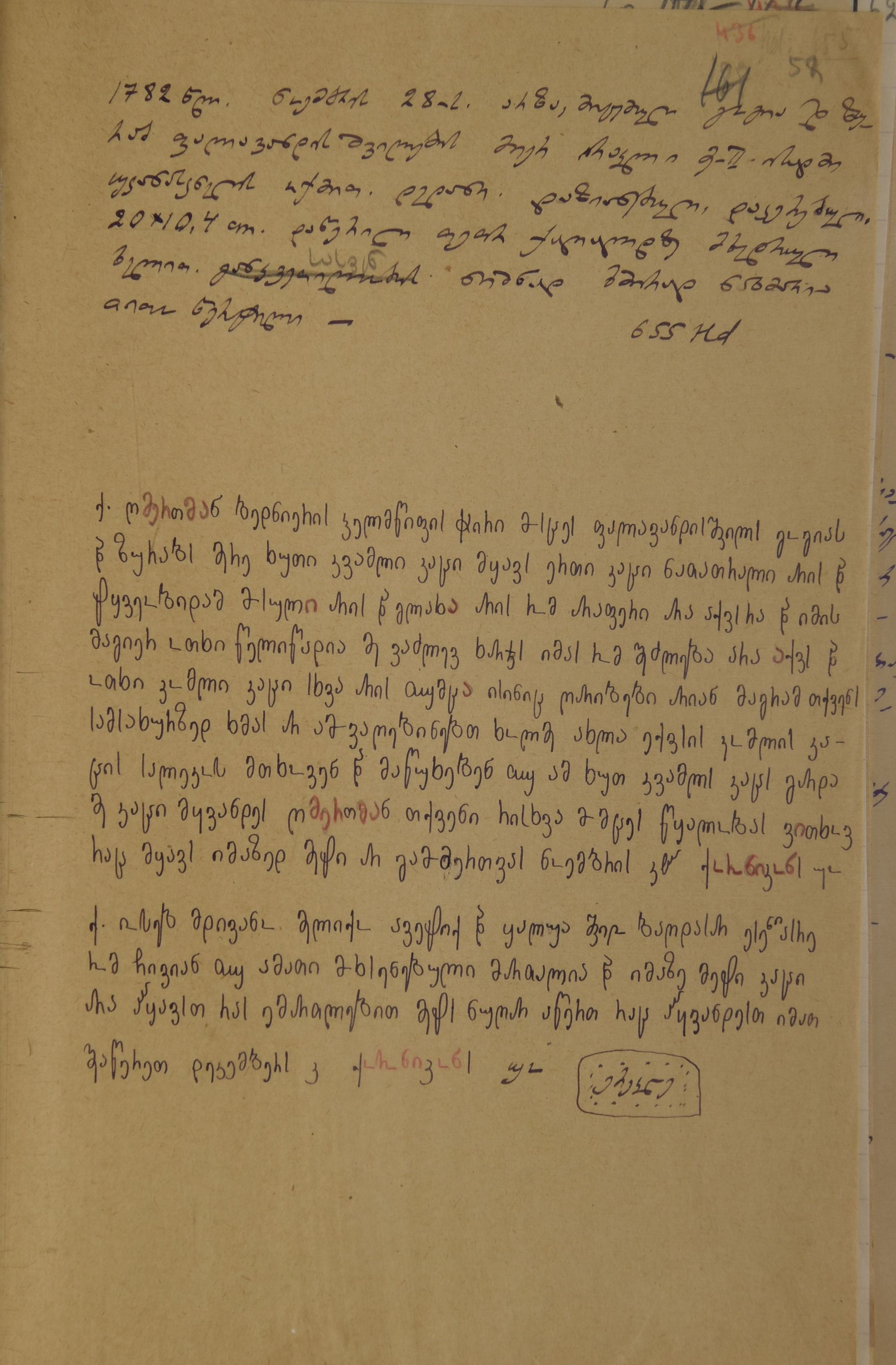 2. დედნის აღწერა გიორგი ბოჭორიძის მიერ: ,,დედანი; დაზიანებული, დაკერებული; 20/10,4; დაწერილი თეთრ ქაღალდზე მხედრული ხელით; განკვეთილობის ნიშნად ხშირად ნახმარია თითო წერტილი".