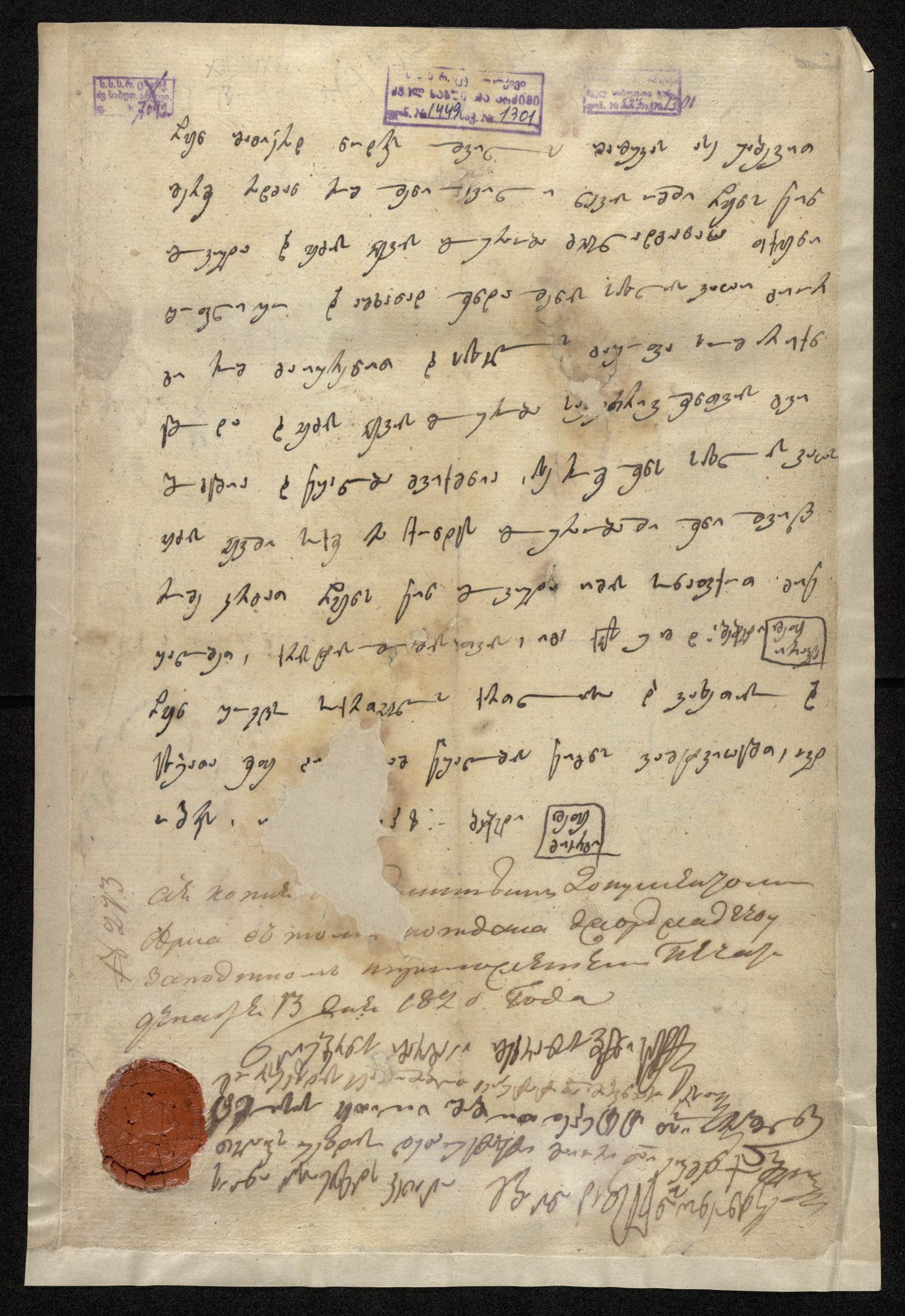 2. რეგისტრირებულია რუსული ადმინისტრაციის მიერ 1820 წ. 13 დეკემბერს, ახლავს წითელი ლუქის ბეჭედი.
