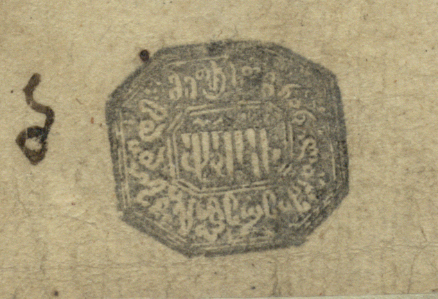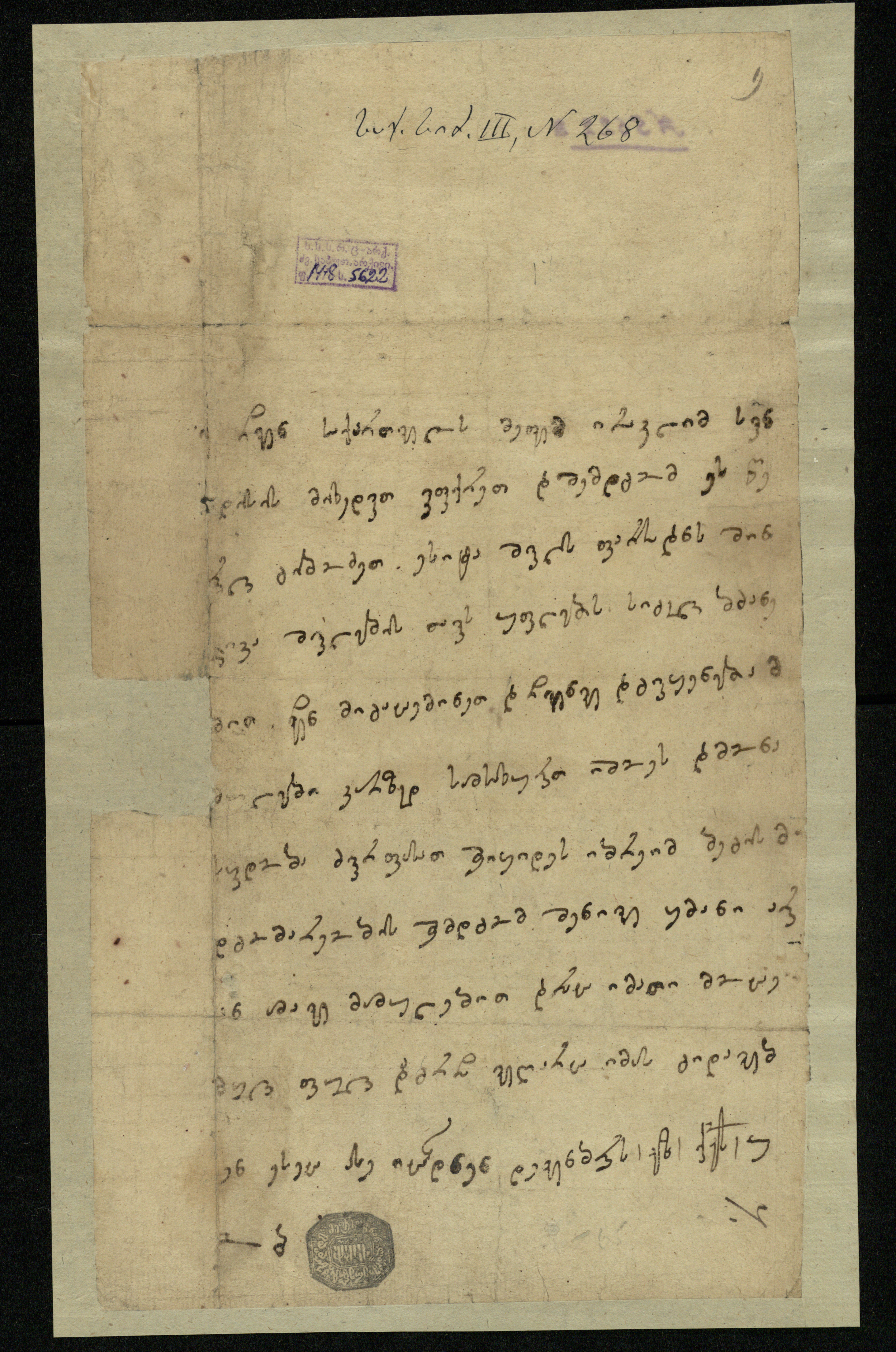 საბუთის r-ს ზედა არშიაზე მინაწერი ექვთიმე თაყაიშვილის ხელით: ,,საქ. სიძ. III, N268.