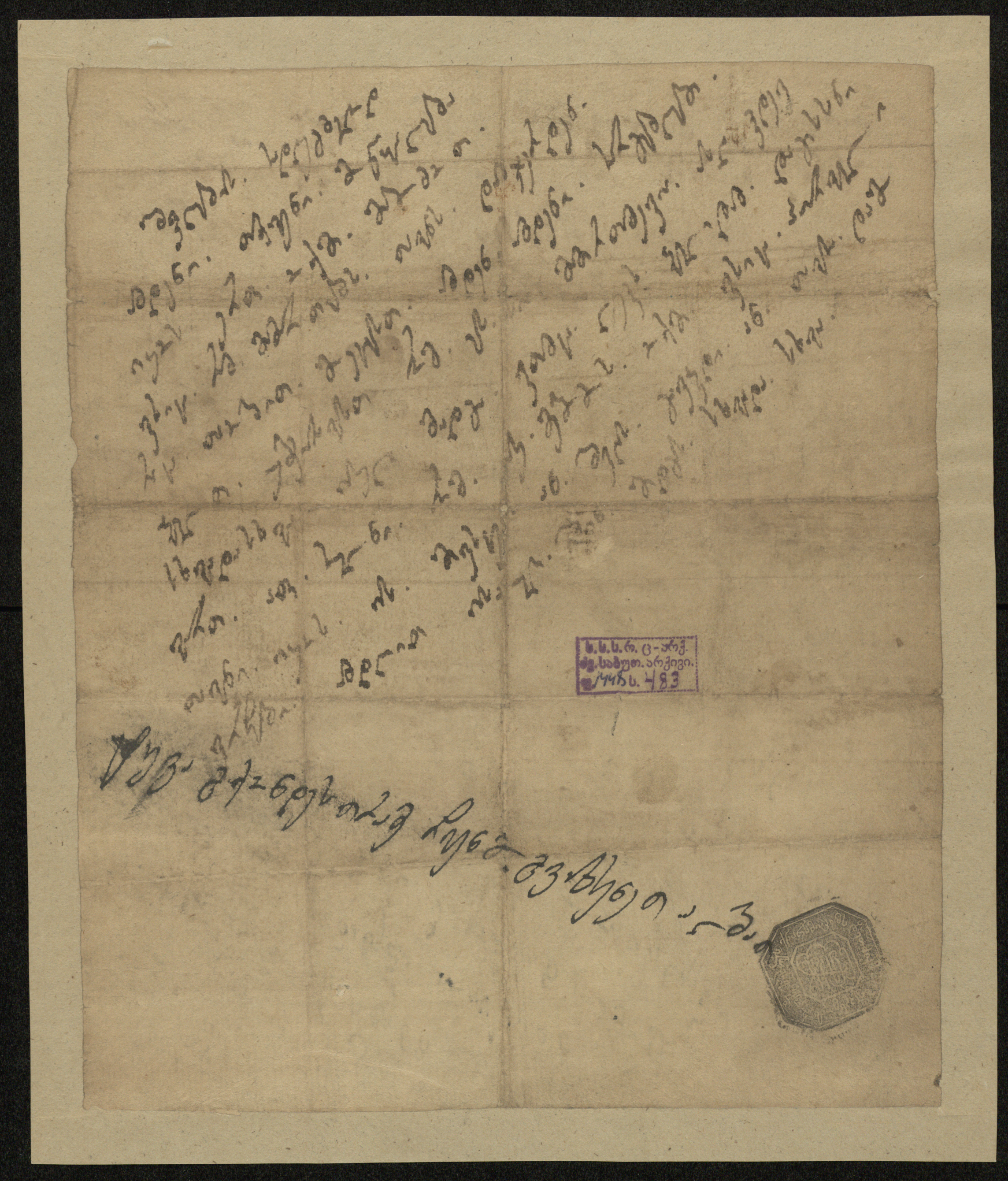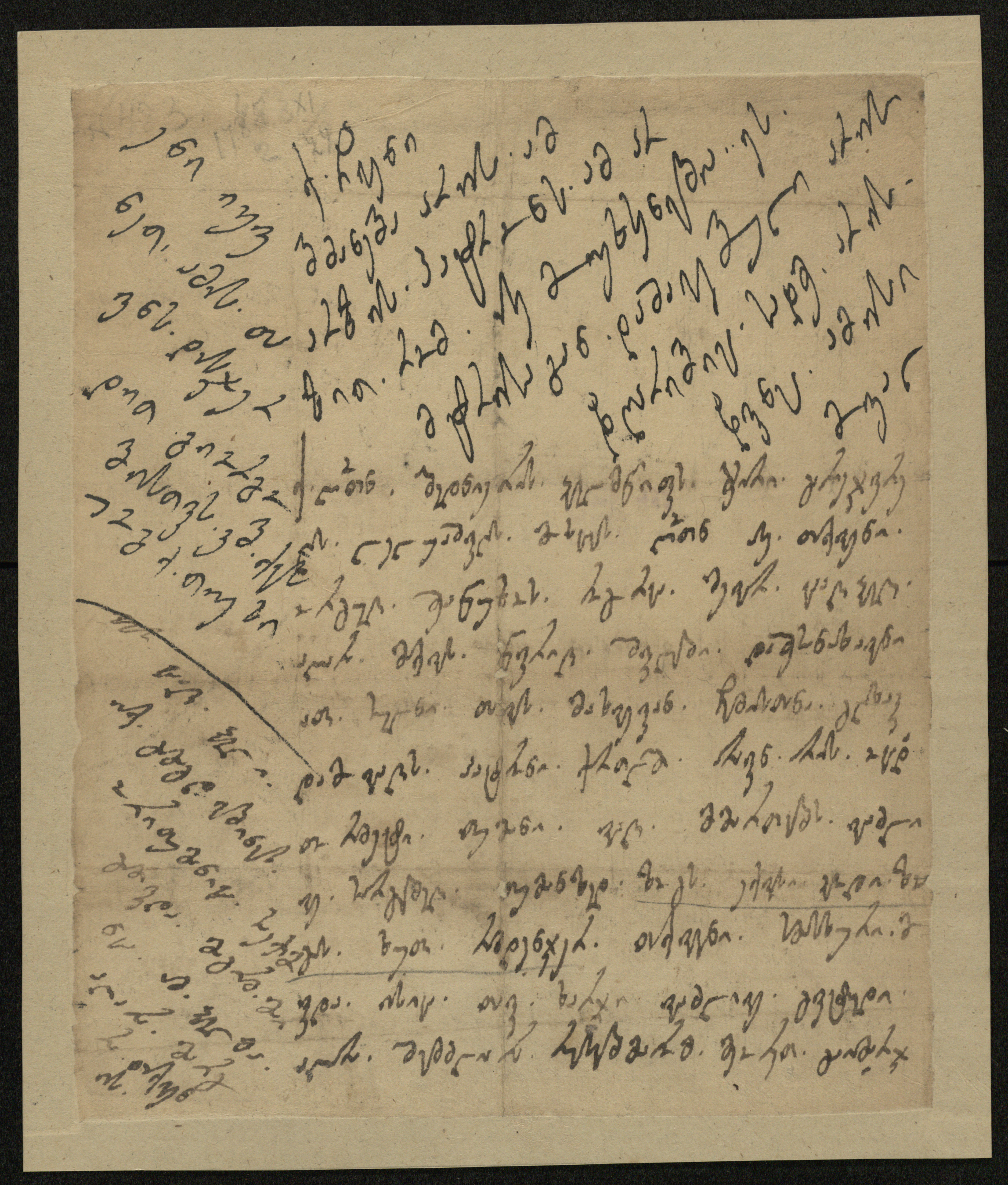 ჭვირნიშნიანი ქაღალდი მოყვითალო, შესრულებული შავი და ყავისფერი მელნით