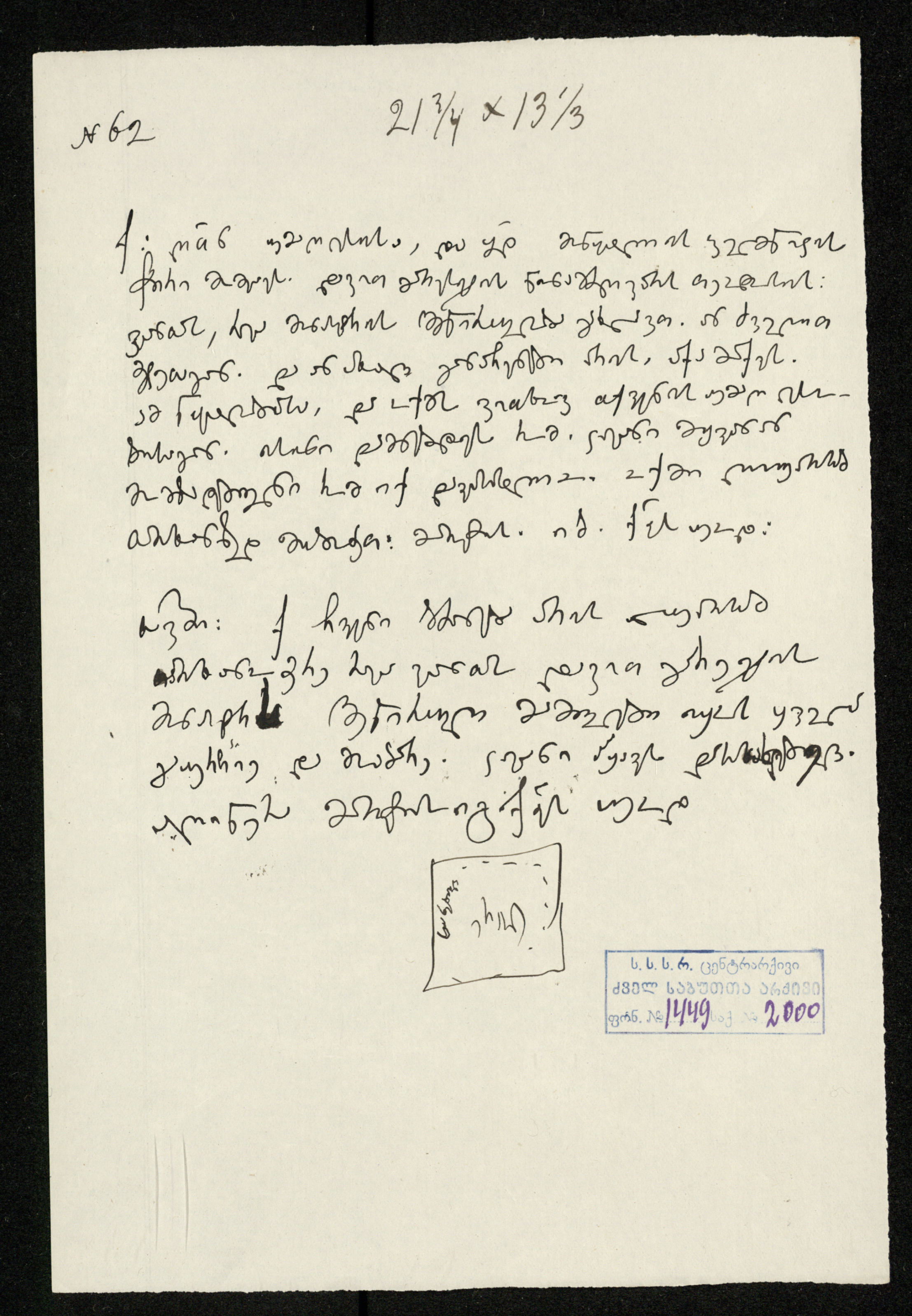2. სარგის კაკაბაძეს მითითებული აქვს საბუთის დედნის ზომა: 213/4X131/3 და ძველი საარქივო-სააღრიცხვო ნომერი:N62"