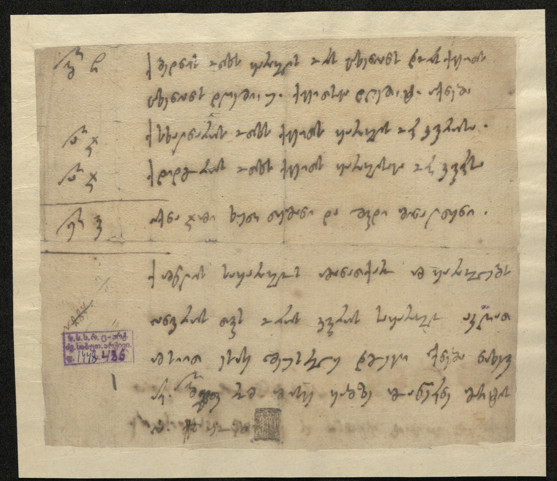 ქაღალდი ღია ყავისფერი ჭვირნიშნით, შესრულებული შავი მელნით