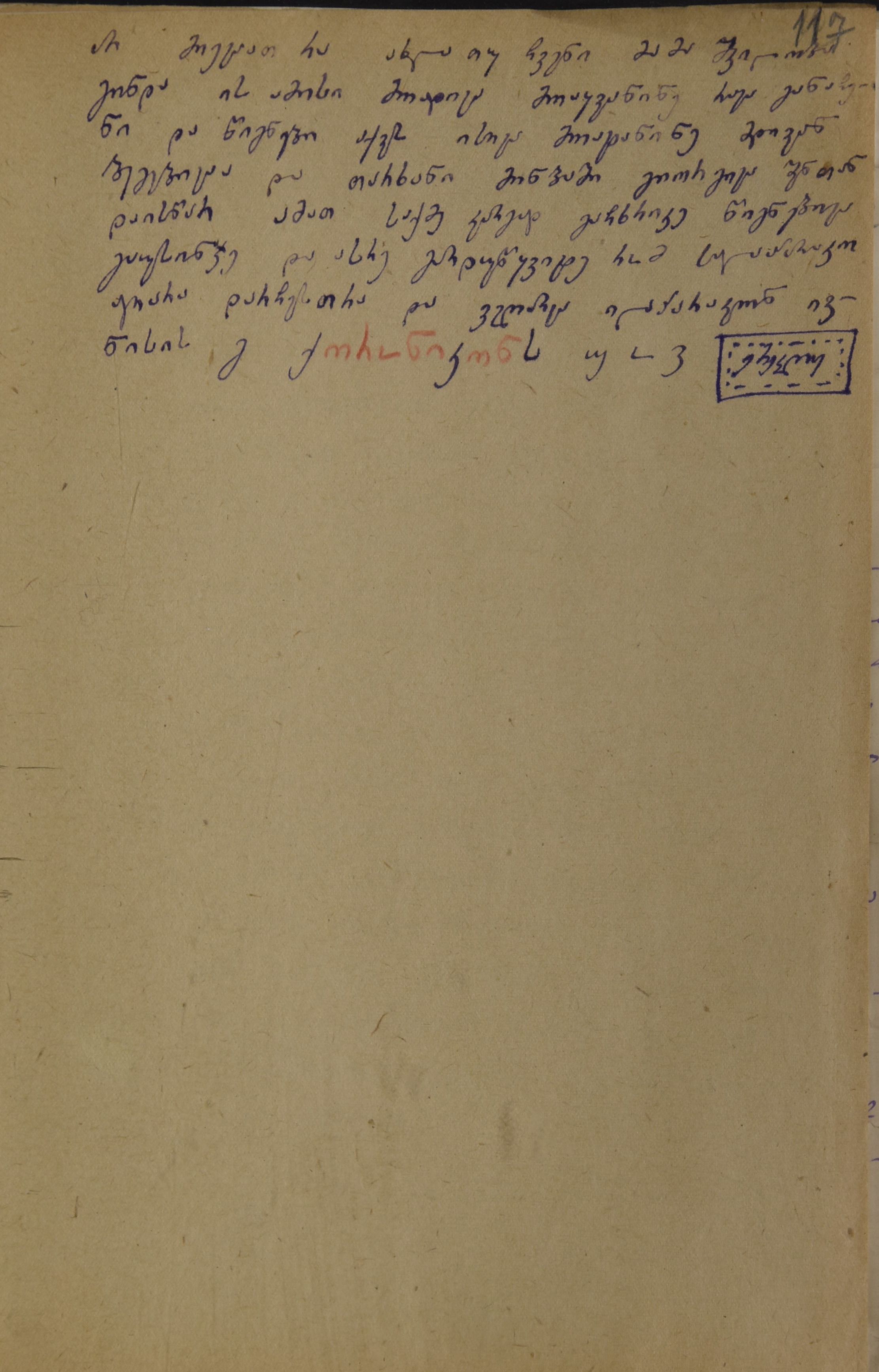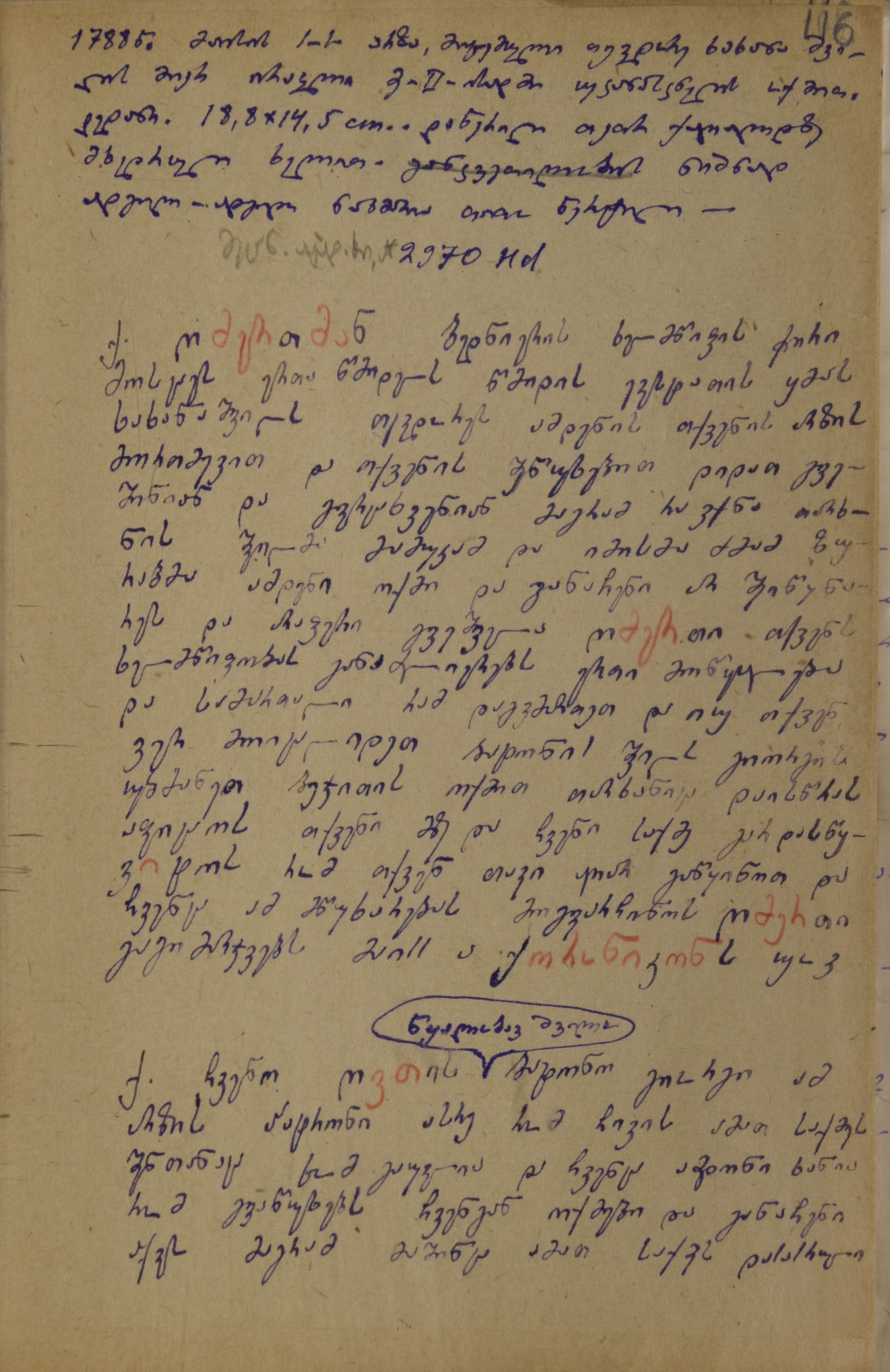 ქაღალდი ღია ყავისფერი დაწერილი ლურჯი მელნით და წითელი ფანქრთ