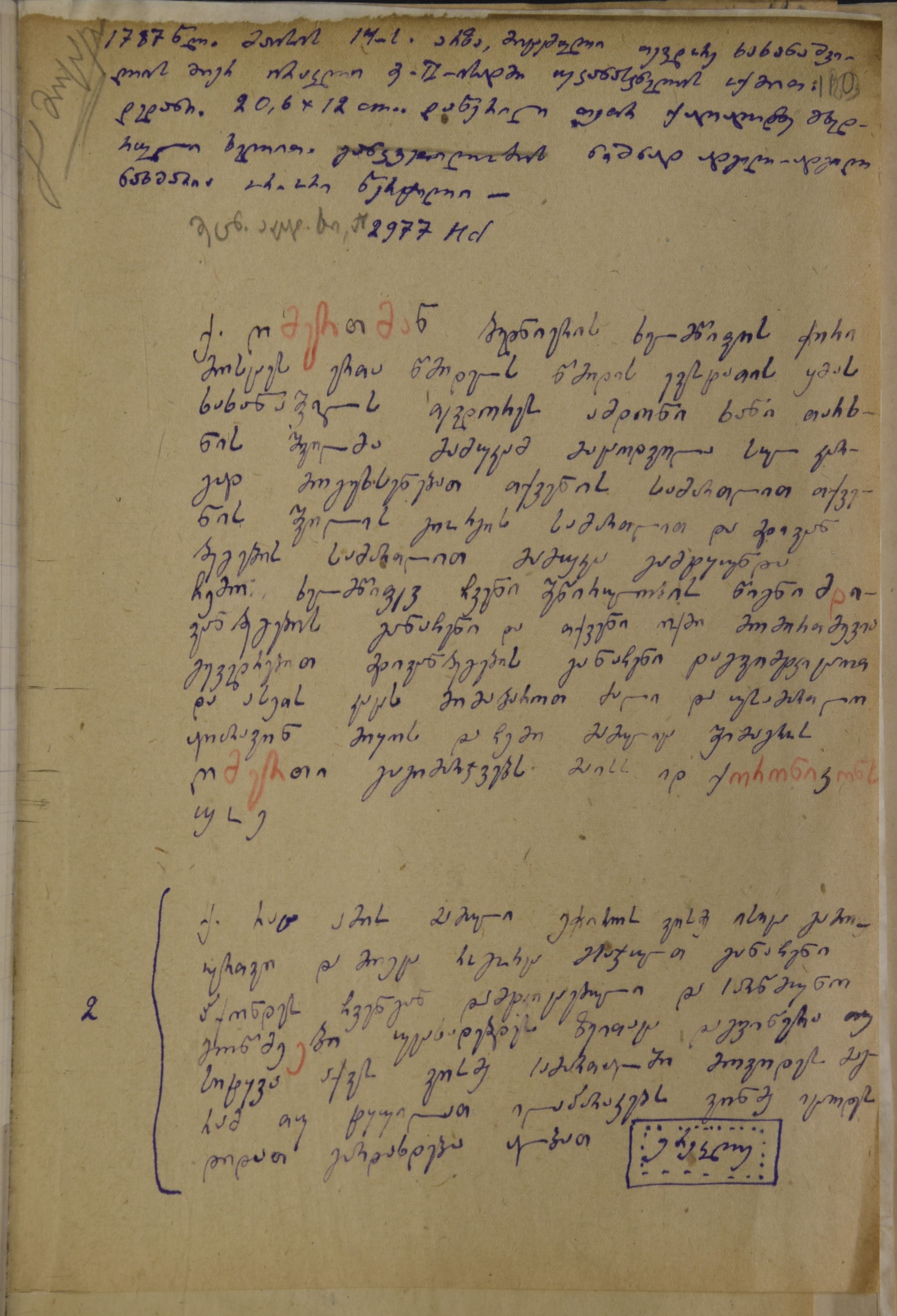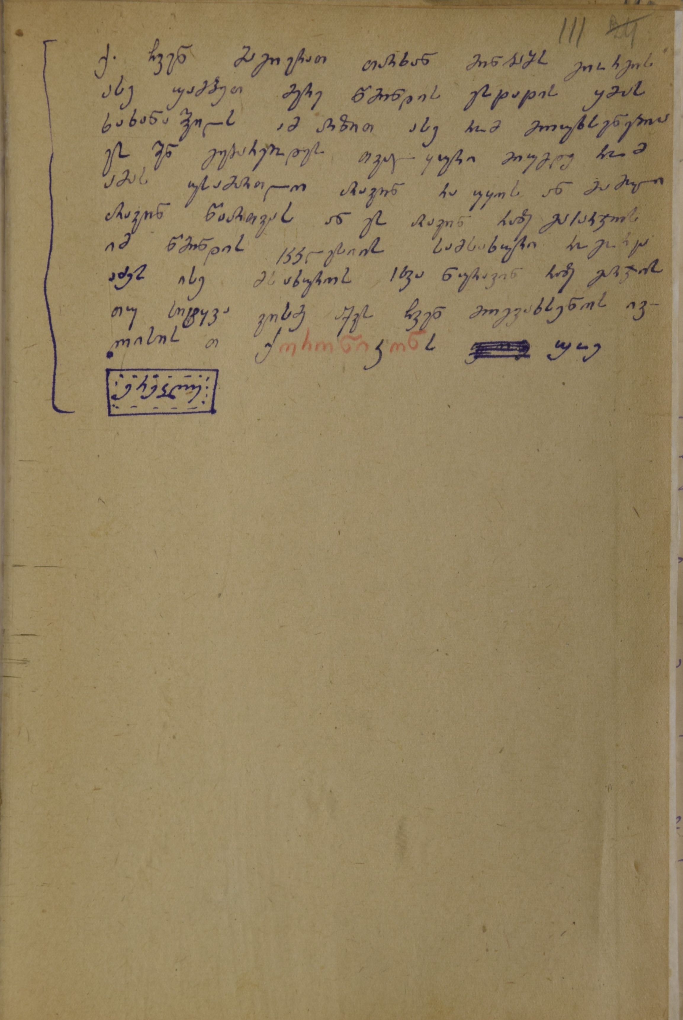 ქაღალდი მოყვითალო, დაწერილი ლურჯი მელნით და წითელი ფანქრით