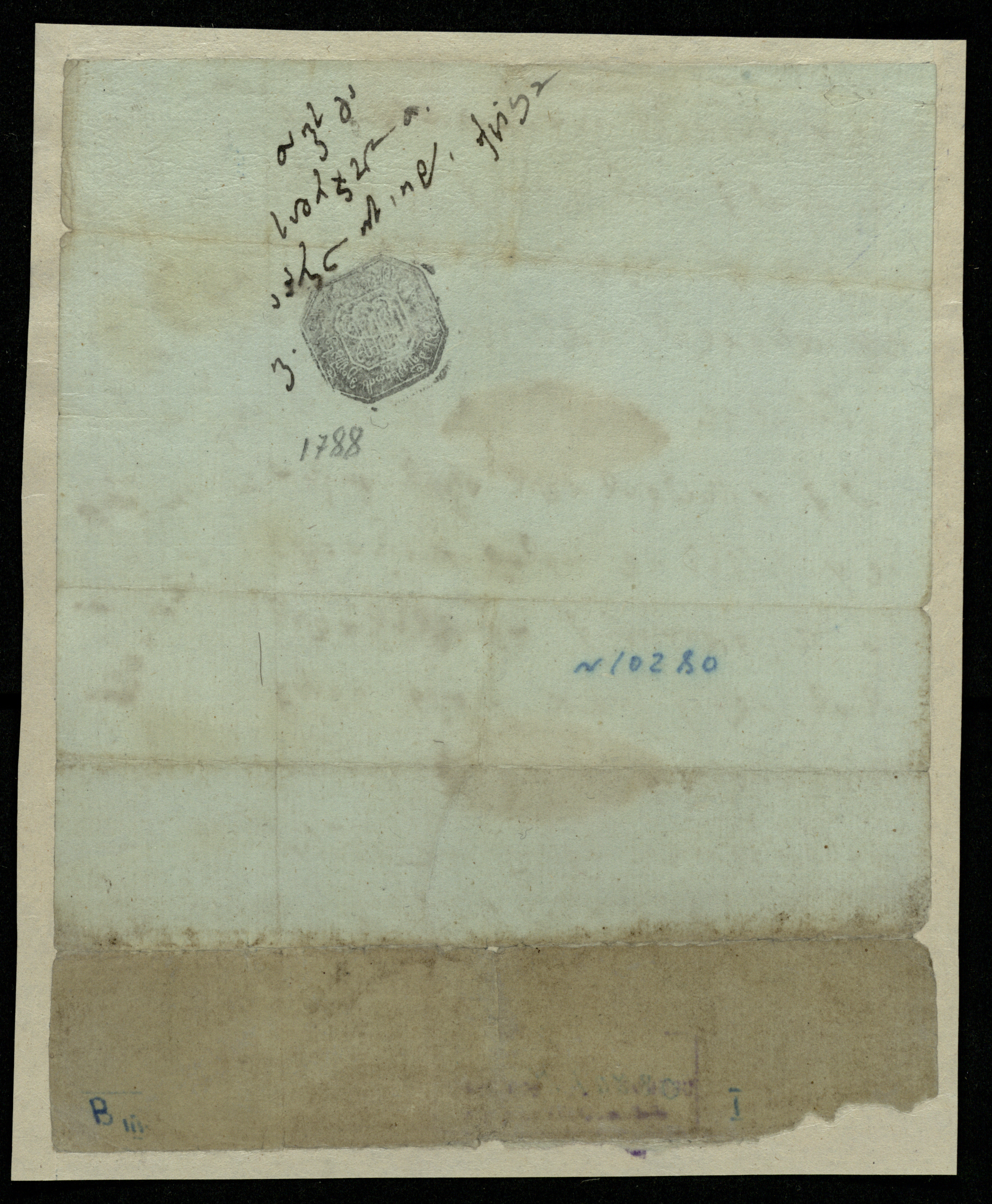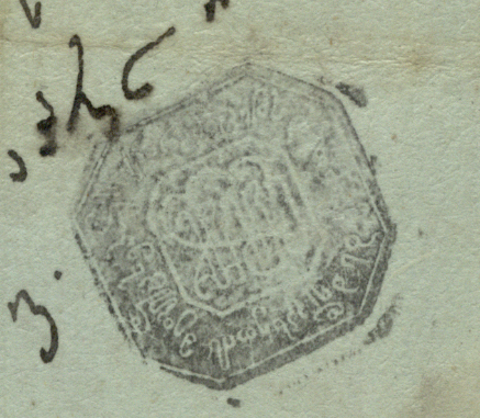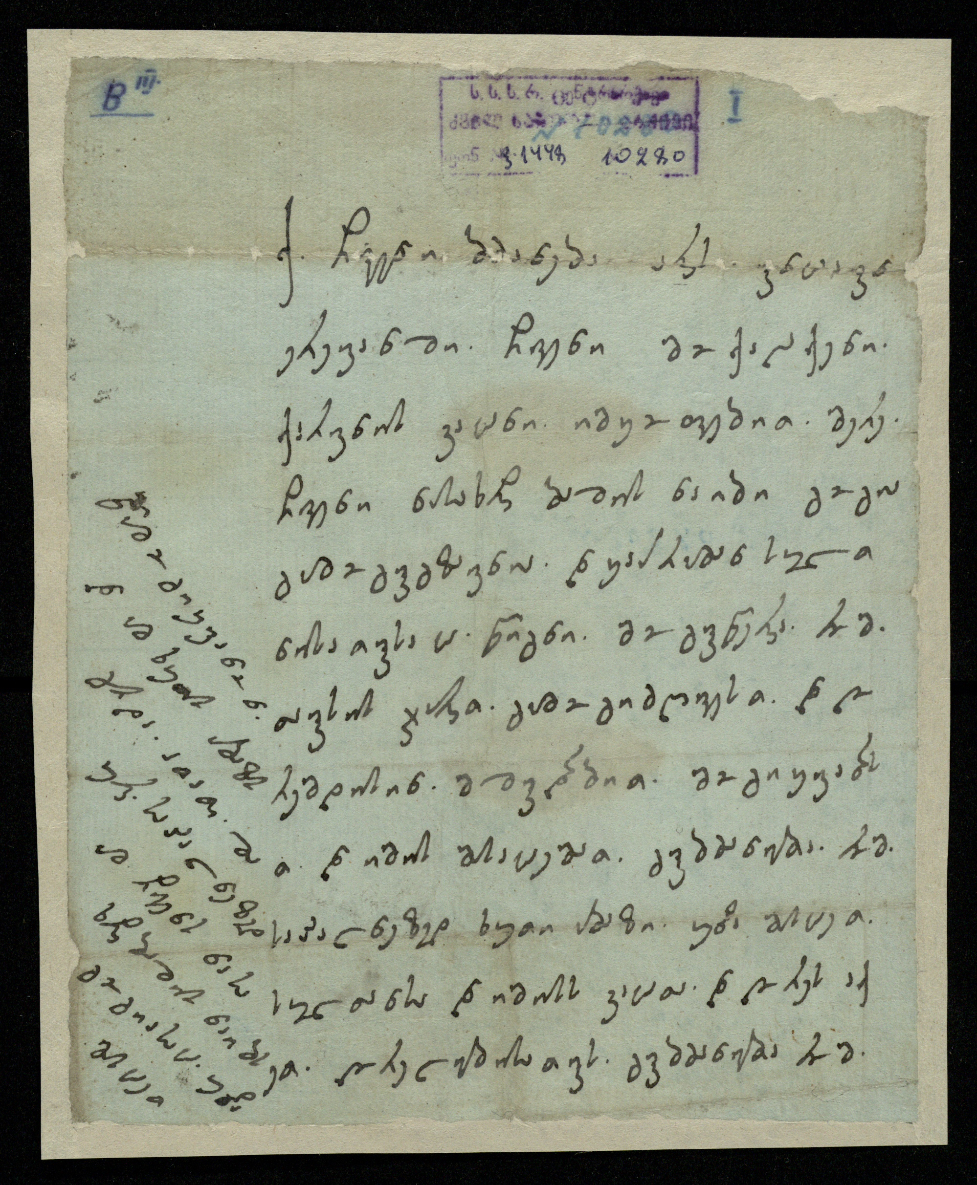 ცისფერი ქაღალდი ჭვირნიშნით, შესრულებული შავი მელნით.