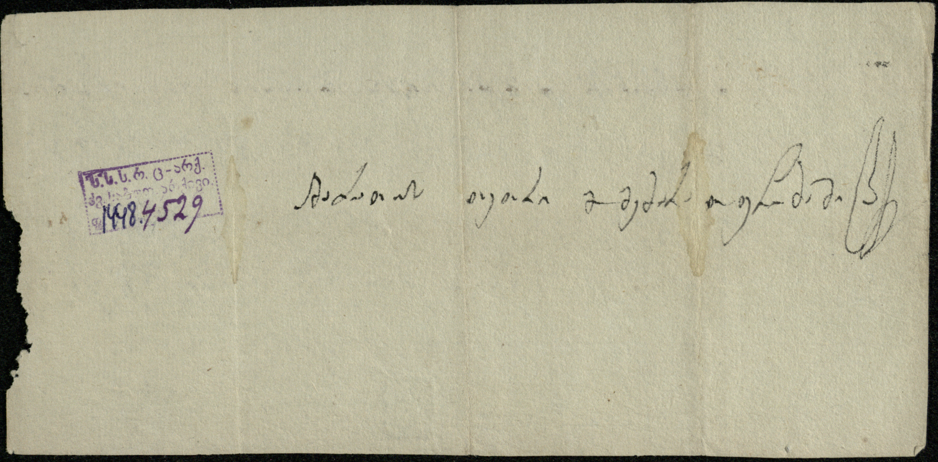 1. საბუთის V-ზე მინაწერი შავი მელნით: ,,ამ ბარათის თეთრი მამებარა თოფჩიბაშს, პაატა (ხელრთვა)“.