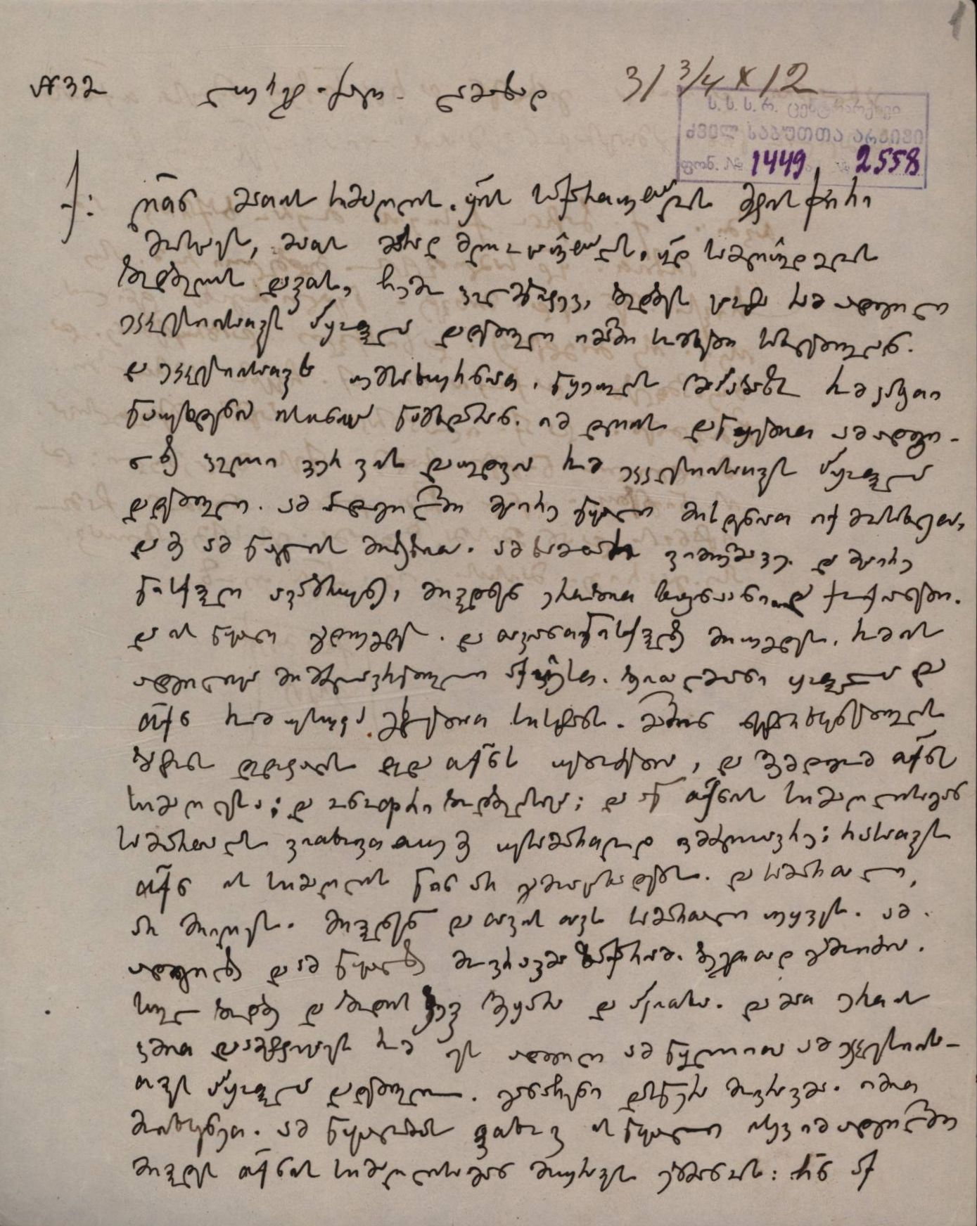2. სარგის კაკაბაძეს მითითებული აქვს საბუთის დედნის აღწერილობა და ზომა: ,,ლურჯ. ქაღ. ლამაზად, 313/4X12 და ძველი საარქივო-სააღრიცხვო ნომერი: N32.