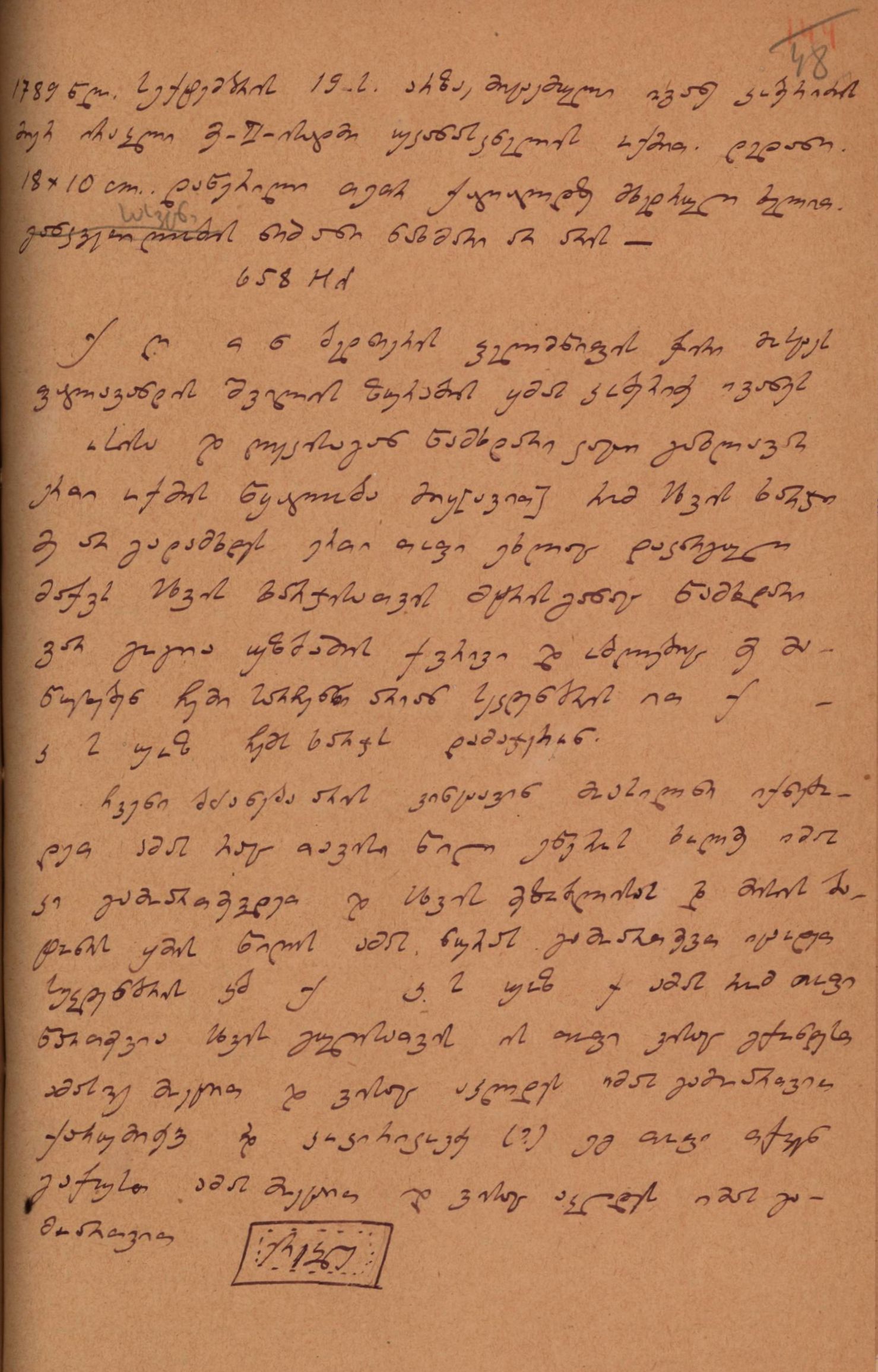 2. დედნის აღწერა გიორგი ბოჭორიძის მიერ: ,,დედანი, 18X10 CM., დაწერილი თეთრ ქაღალდზე მხედრული ხელით; განკვეთილობის ნიშანი ნახმარი არ არის".