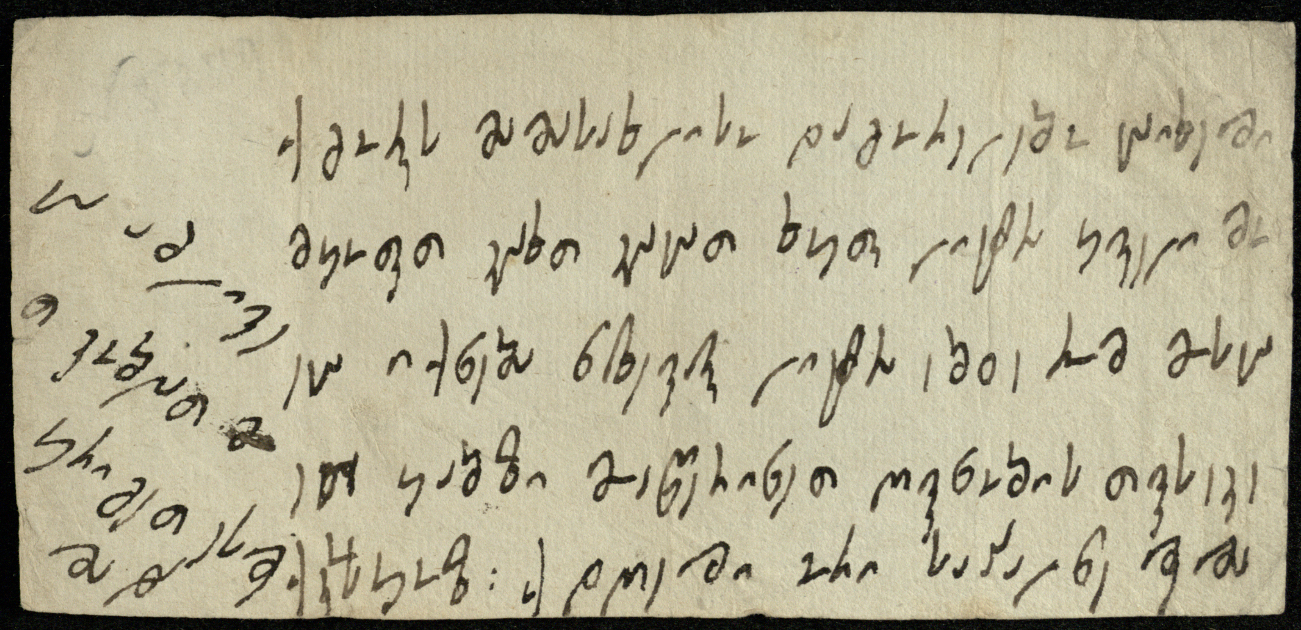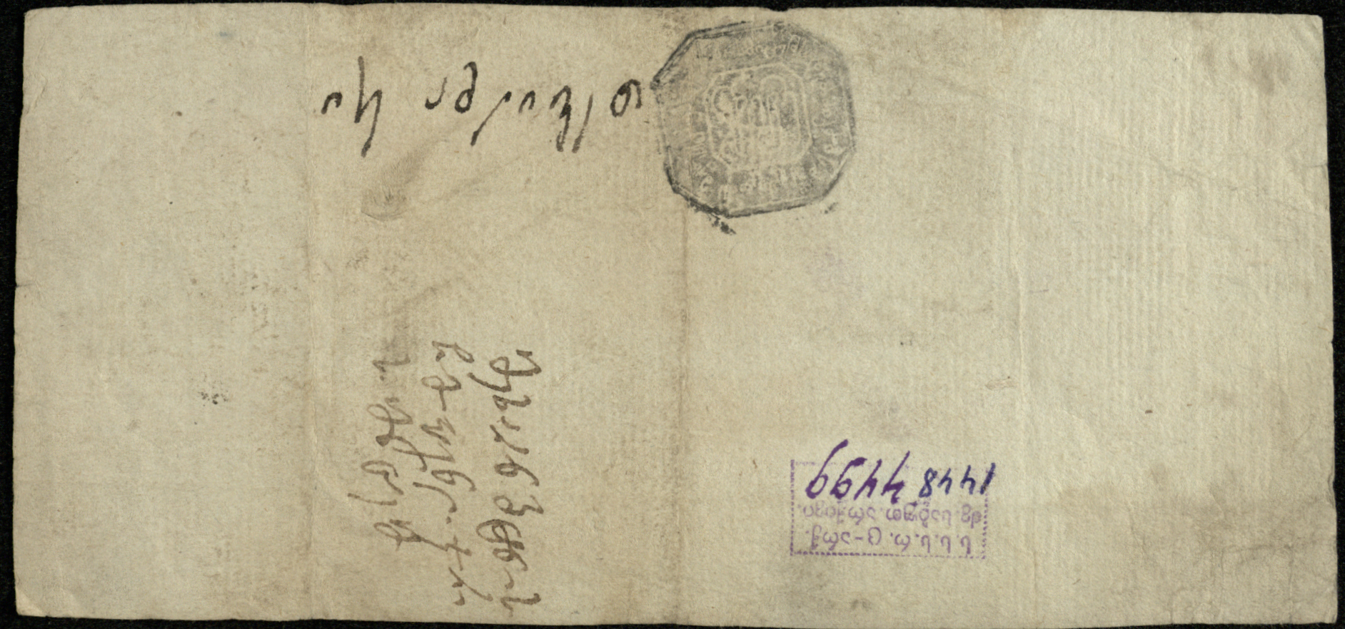 ჭვირნიშნიანი ქაღალდი თეთრი, შესრულებული შავი მელნით.