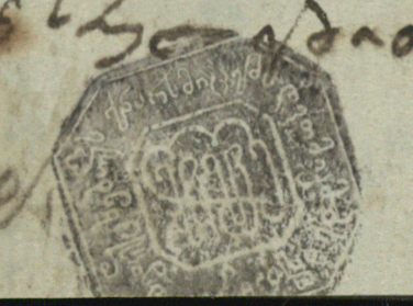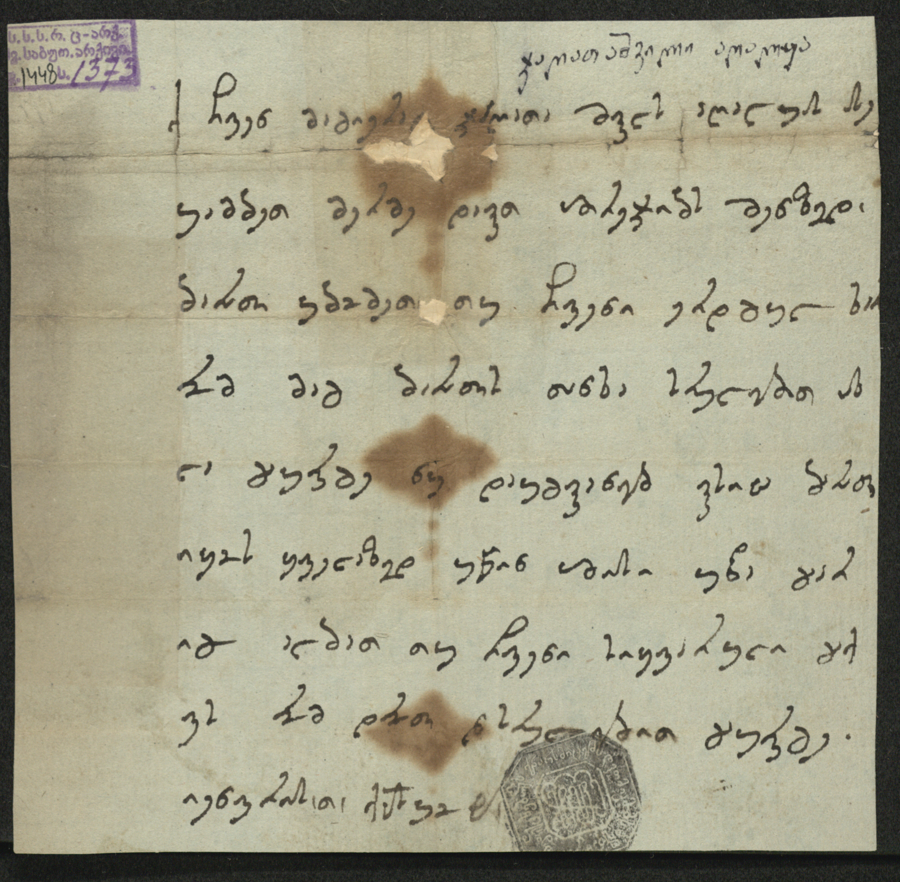 ცისფერი ქაღალდი ჭვირნიშნით და ყავისფერი ლაქებით, შესრულებული შავი მელნით