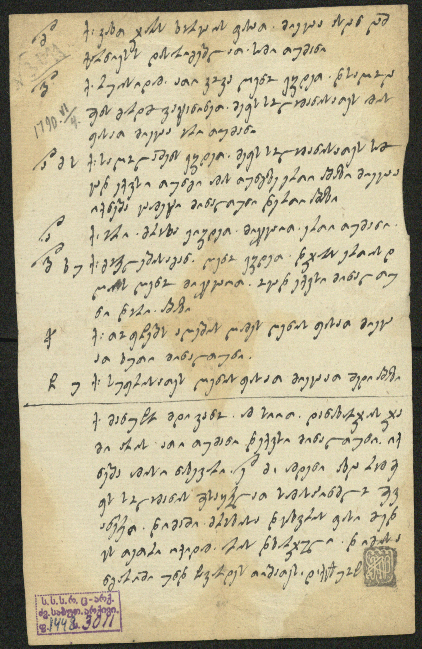 ჭვირნიშნიანი ქაღალდი ნაცრისფერი ყვითელი ლაქებით, შესრულებული შავი და ყავისფერი მელნით,