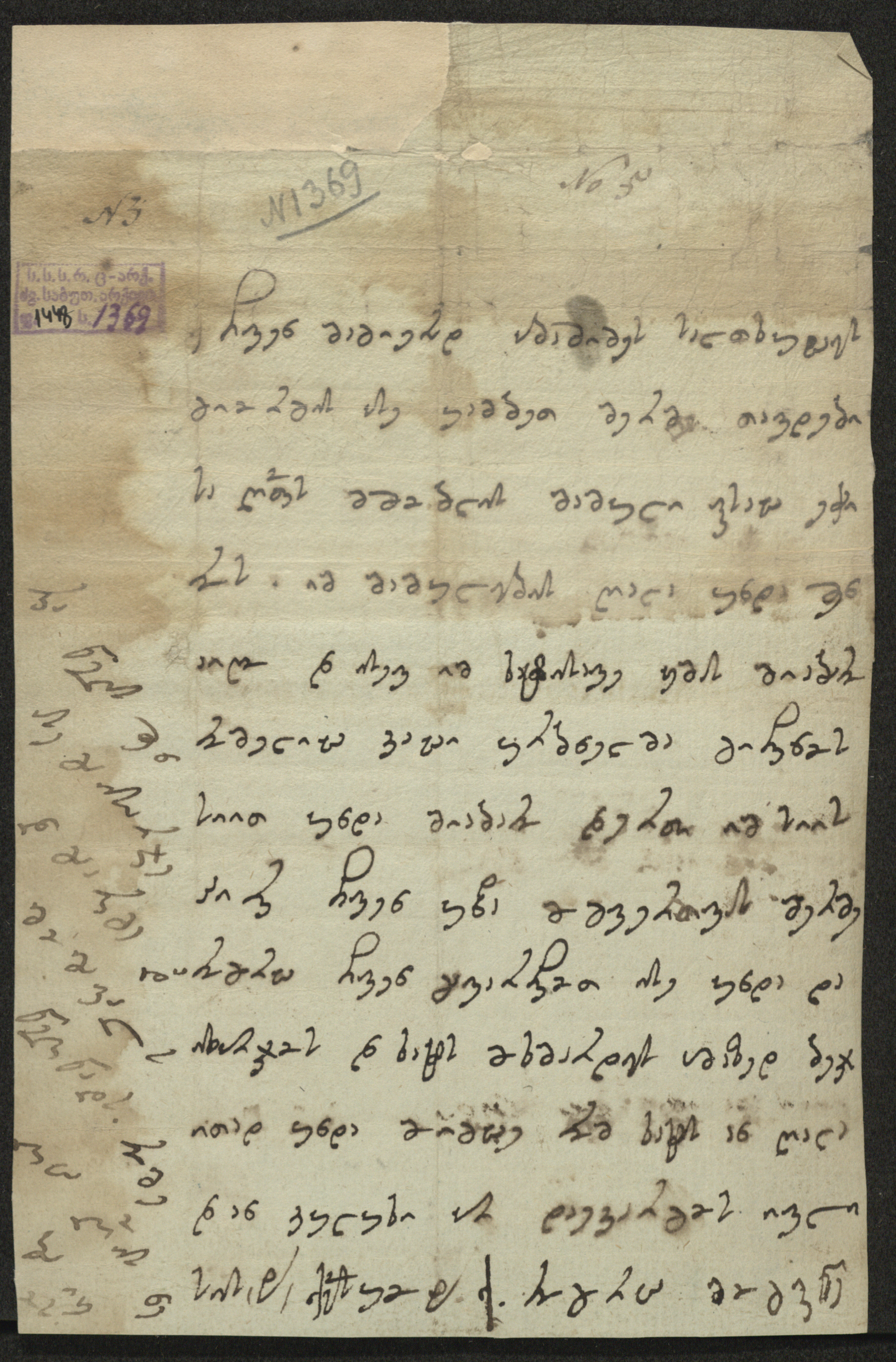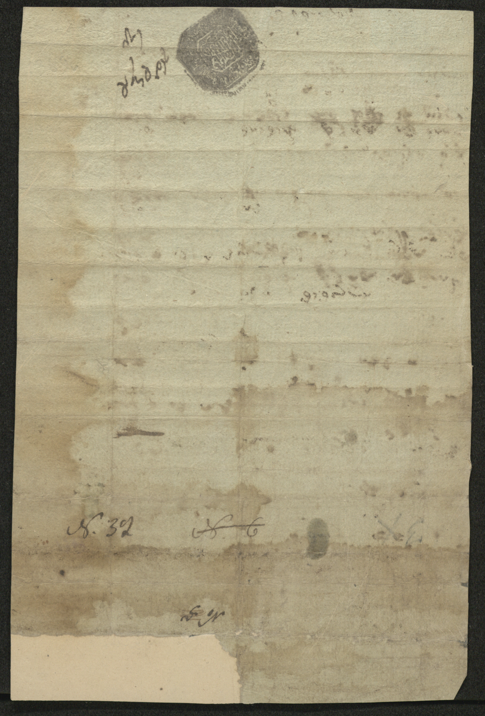 ქაღალდი ნაცრისფერი ყავისფერი ლაქებით, ჭვირნიშნით და ვერჟერით, შესრულებული შავი მელნით