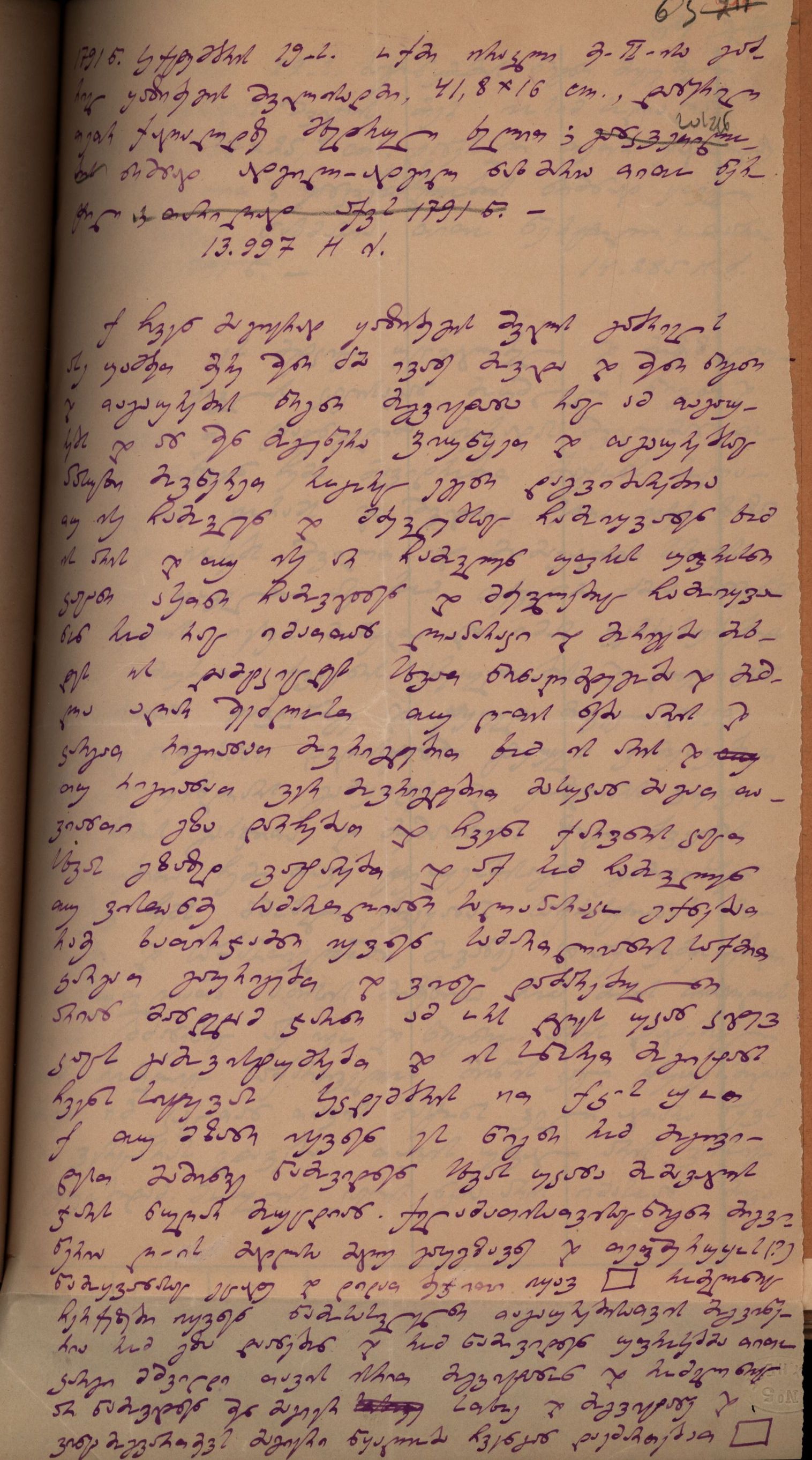 ქაღალდი მოყვითალო, დაწერილი ლურჯი მელნით.
