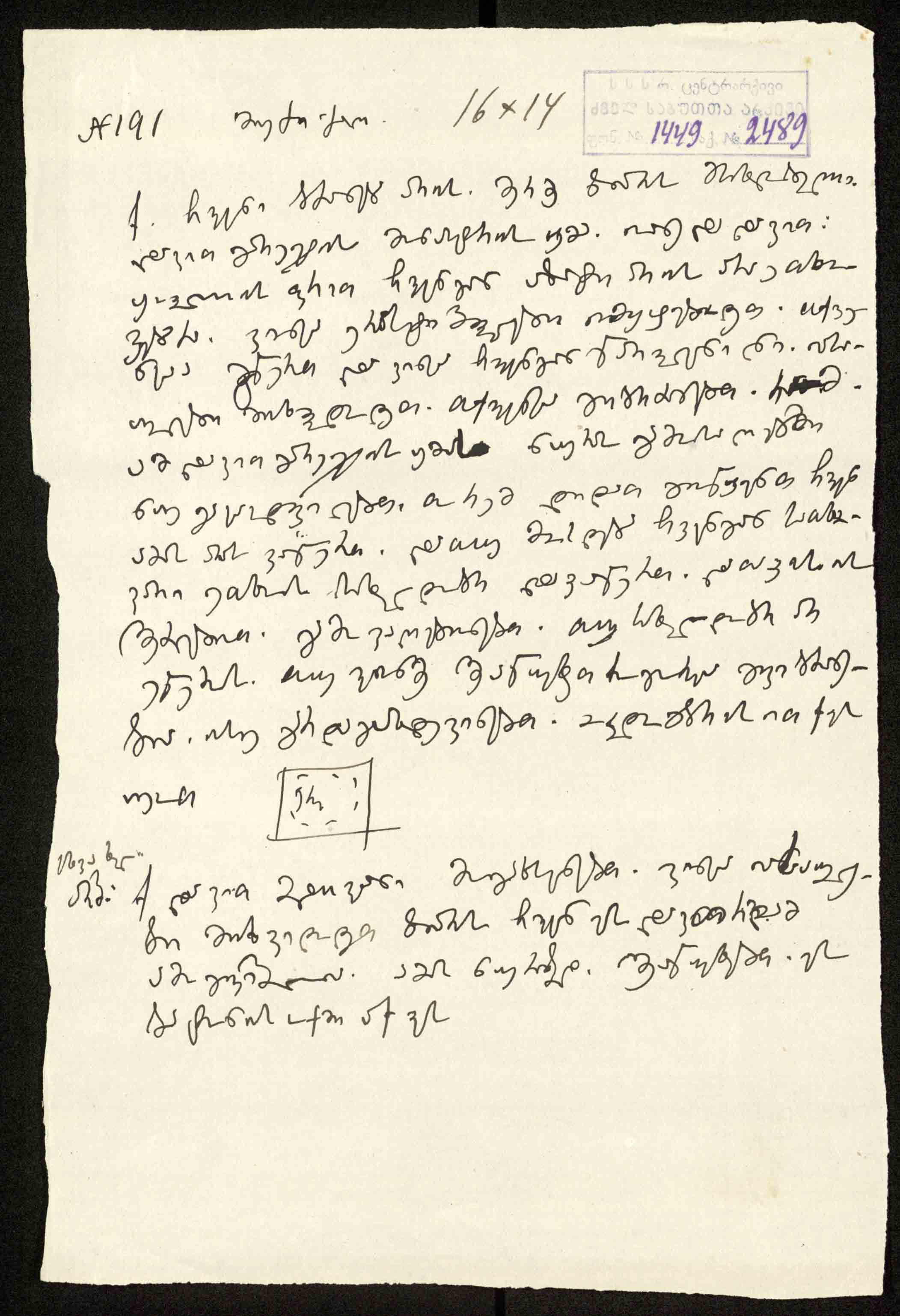 2. სარგის კაკაბაძეს მითითებული აქვს საბუთის დედნის აღწერილობა და ზომა: ,,მუქი ქაღ.“, 16X14 და ძველი საარქივო-სააღრიცხვო ნომერი: N191.