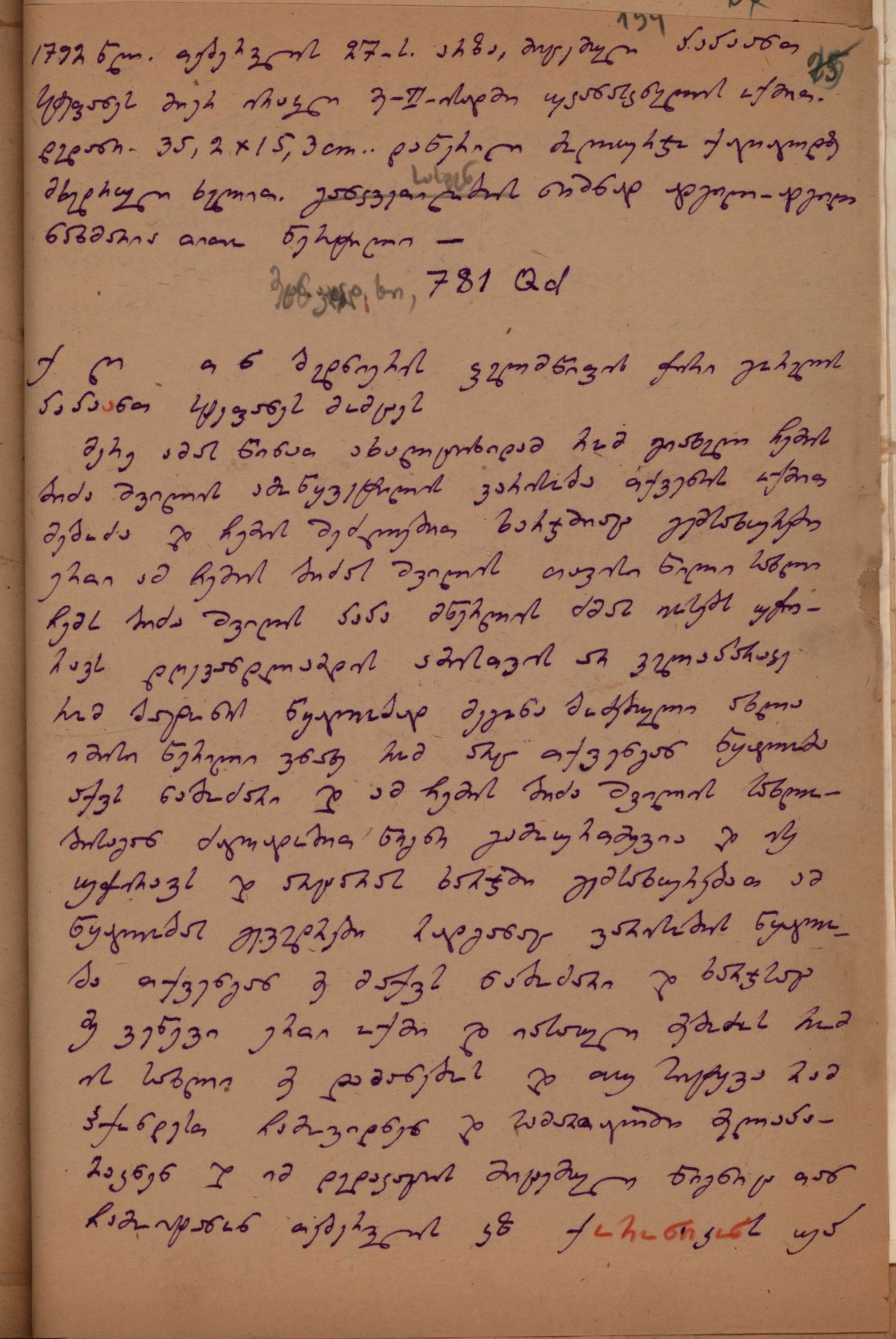 დედნის აღწერა გ. ბოჭორიძის მიერ: ,,დედანი, 35,2 X15,3 CM., დაწერილი მოლუტჯო ქაღალდზრ მხედრული ხელით; განკვეთილობის ნიშნად ადგილ-ადგილ ნახმარია თითო წერტილი", დედანი, ხეც, Qd 781