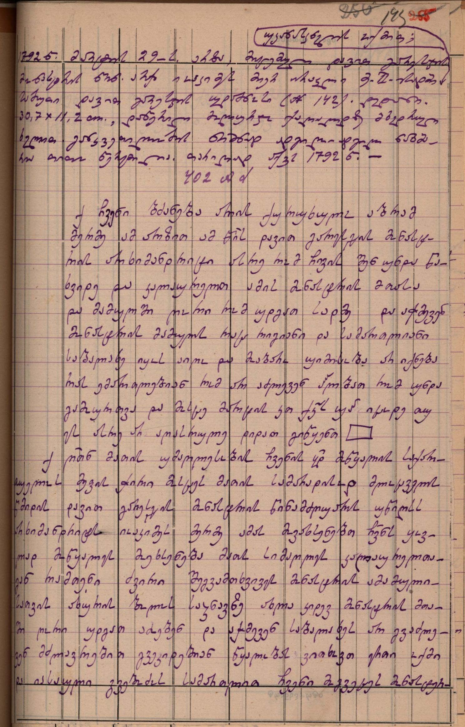 2. დედნის აღწერა გიორგი ბოჭორიძის მიერ: ,,დედანი 30,7x11,2 cm., დაწერილი მოლურჯო ქაღალდზე მხედრული ხელით; განკვეთილობის ნიშნად ადგილ-ადგილ ნახმარია თითო წერტილი", დედანი, ხეც, Ad 402.