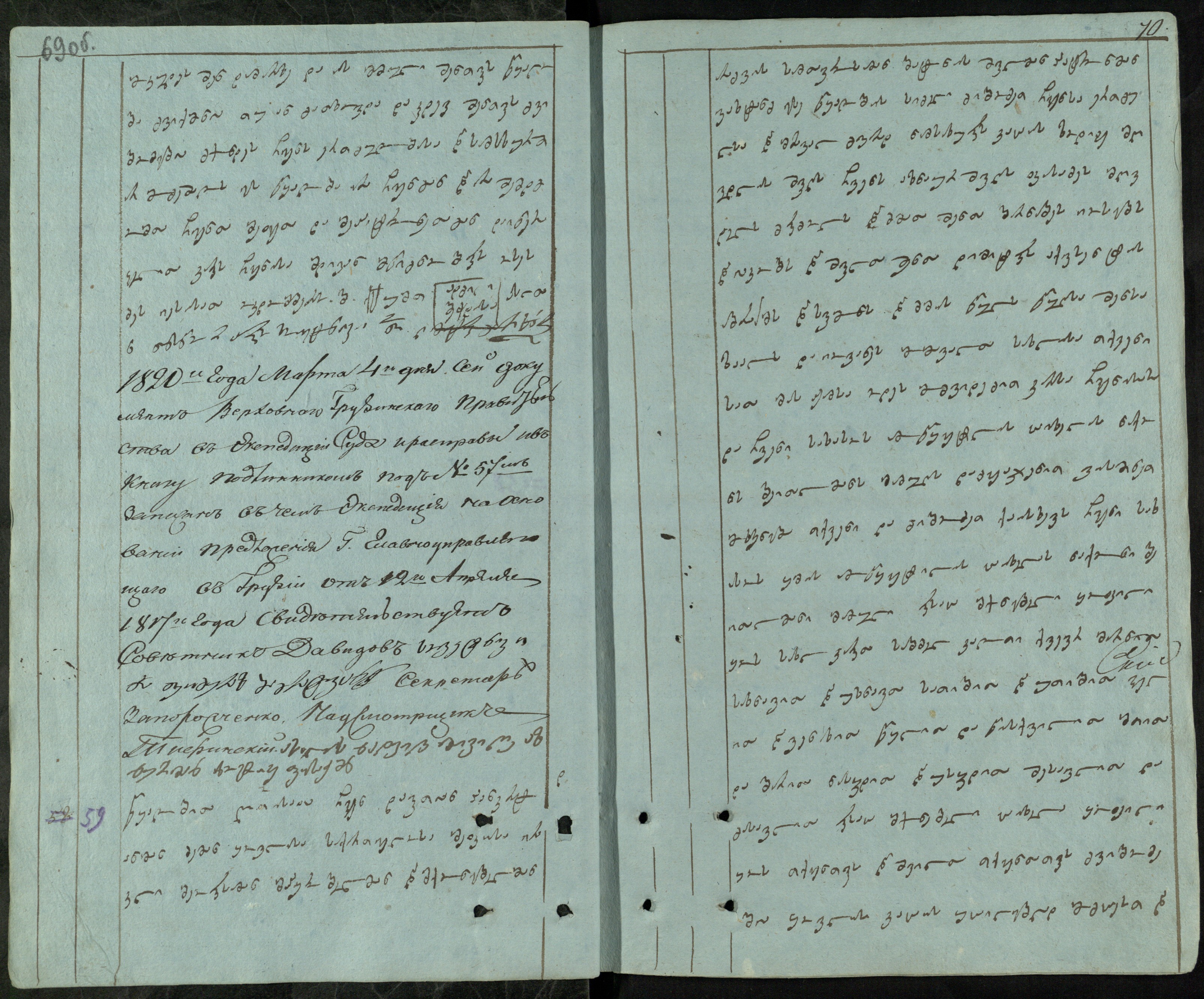 ცისფერი ქაღალდი, დაწერილი შავი მელნით.