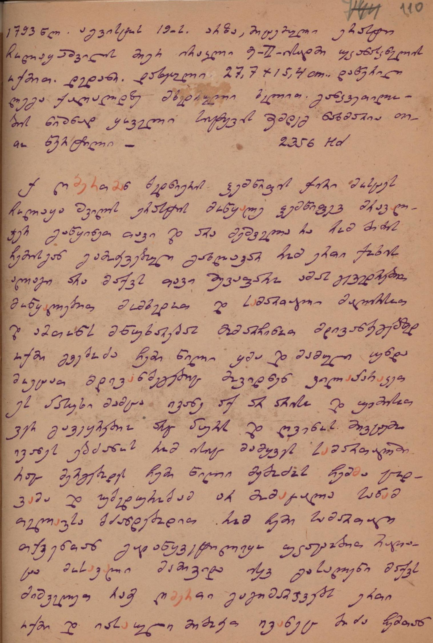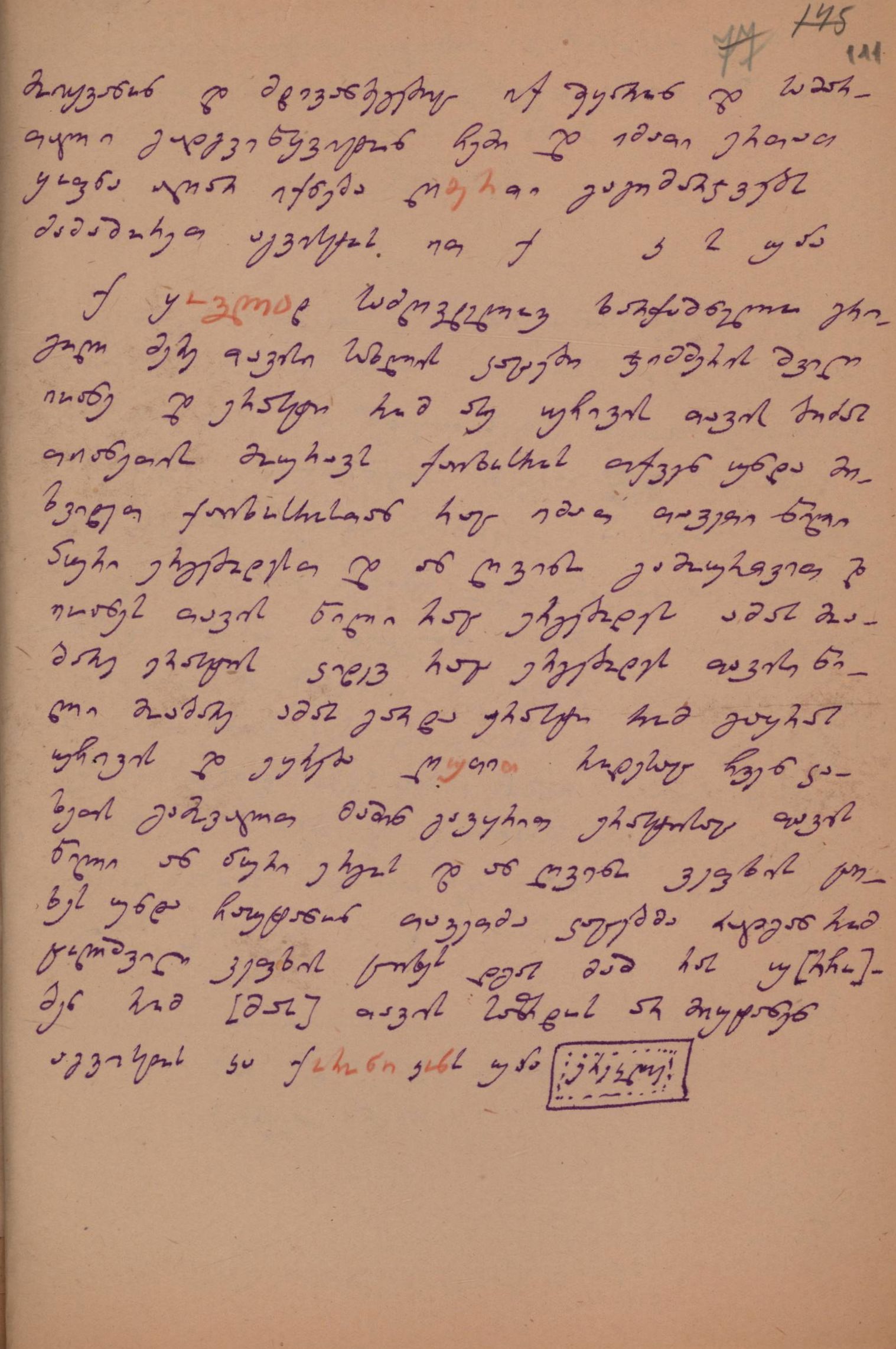 ქაღალდი მოყავისფერო, დაწერილი ლურჯი მელნით; რამდენიმე სიტყვა დაწერილია წითელი ფანქრით