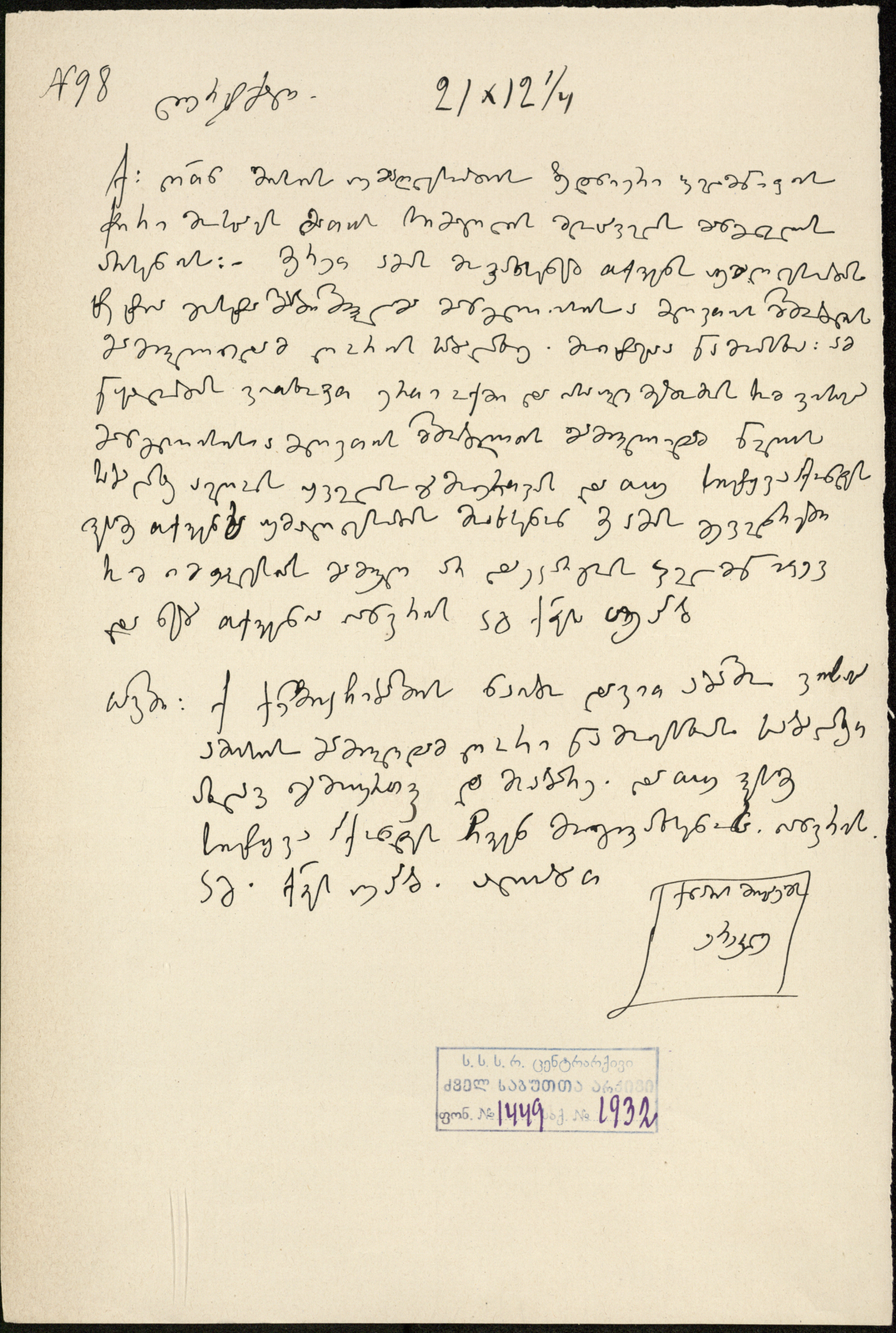 2. ს.არგის კაკაბაძეს მითითებული აქვს საბუთის აღწერილობა, ზომა: ,,ლურჯ. ქაღ.; 21X 12 1/4 და ძველი საარქივო-სააღრიცხვო ნომერი: N98.