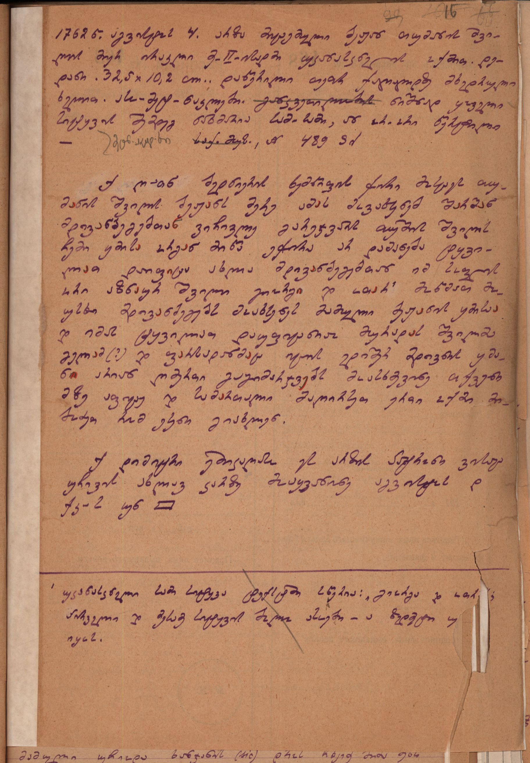 2. დედნის აღწერა გიორგი ბოჭორიშვილის მიერ: ,,დედანი32,5/10,2, დაწერილი თეთრ ქაღალდზე მხედრული ხელით, ასი-მეტ-ნაკლები; განკვეთილობის ნიშნად ყოველი სიტყვის შემდეგ ნახმარია სამ-სამი ან ორ-ორი წერტილი", დედანი, ხეც,Sd 489.