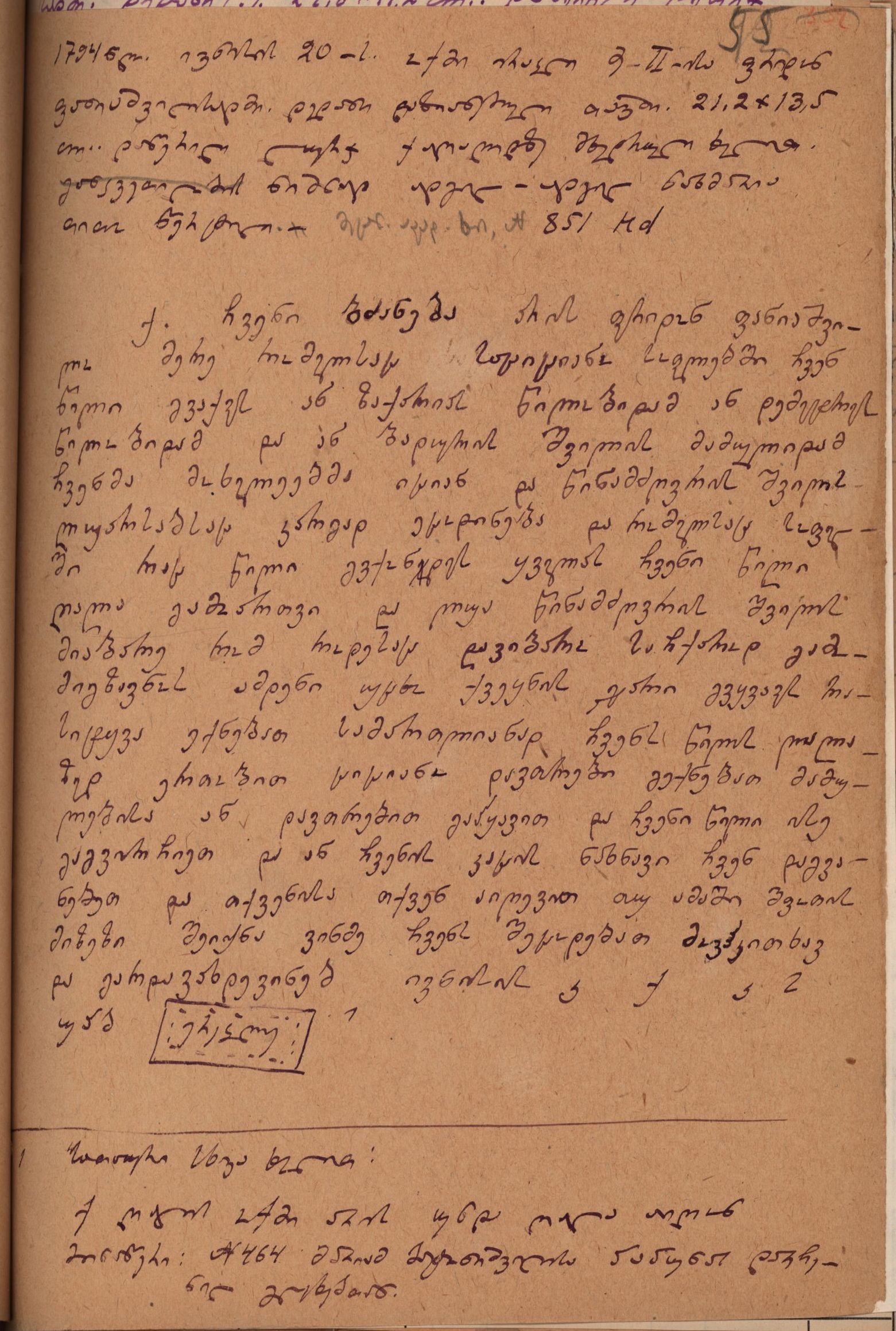 4. დედნის აღწერა გიორგი ბოჭორიძის მიერ: დედანი, დაზიანებული თავში, 21,2X13,5 cm., დაწერილი ლურჯ ქაღალდზე მხედრული ხელით; განკვეთილობის ნიშნად ადგილ-ადგილ ნახმარია თითო წერტილი".