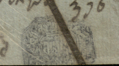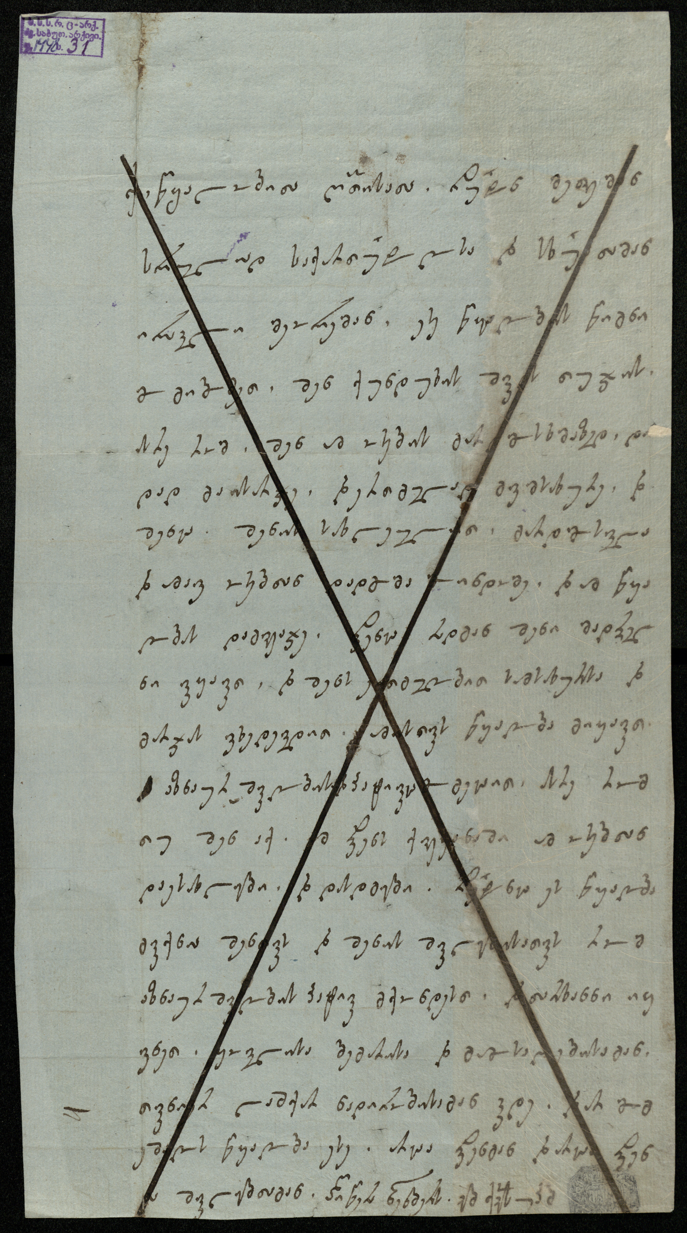 ჭვირნიშნიანი ქაღალდი ცისფერი, შესრულებული ყავისფერი მელნით.