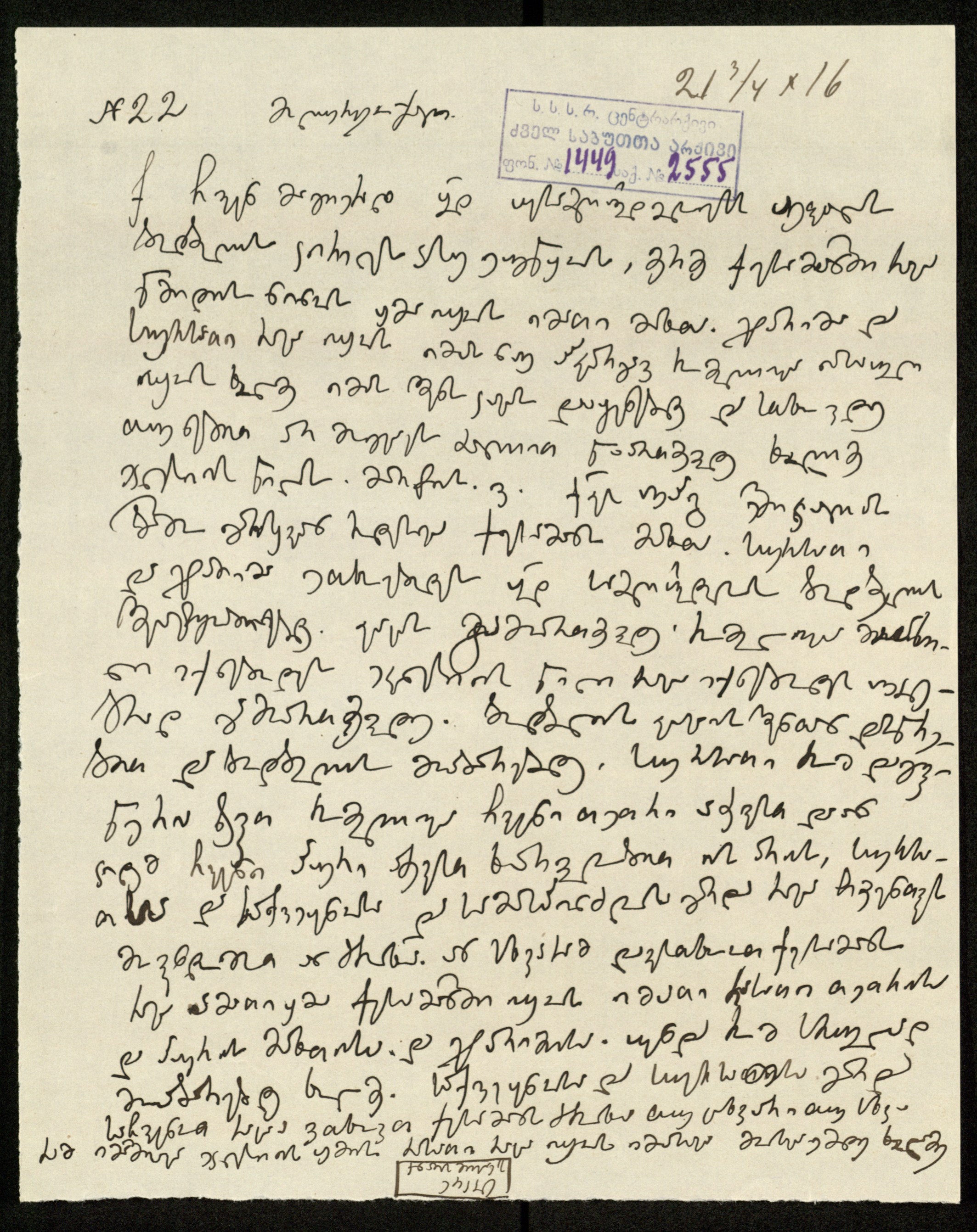 3. სარგის კაკაბაძეს მითითებული აქვს ქაღალდის ფერი და ზომა: ,,მოლურჯო ქაღ.; 24,3/4X 16“ და ძველი საარქივო-სააღრიცხვო ნომერი: N22