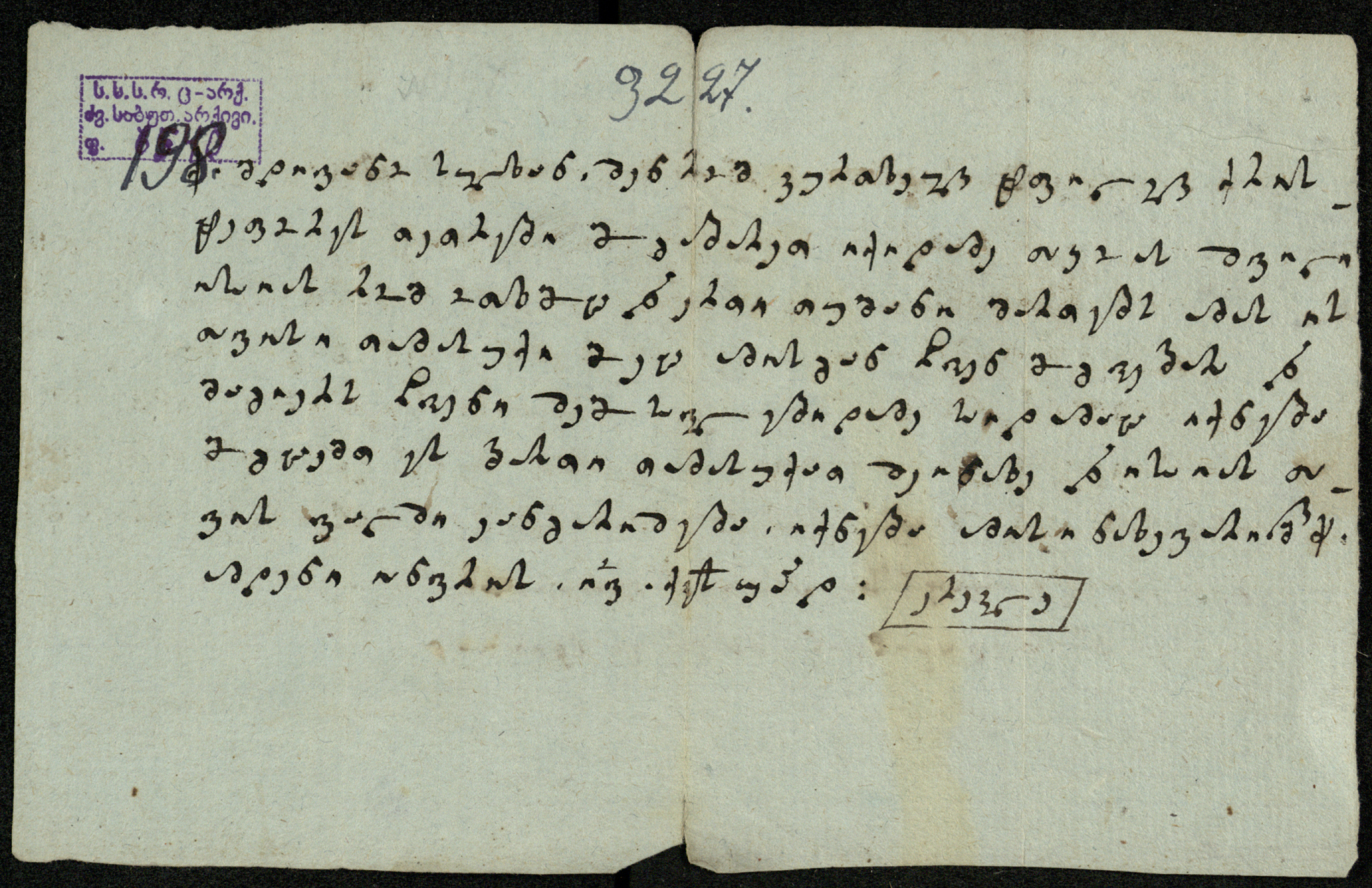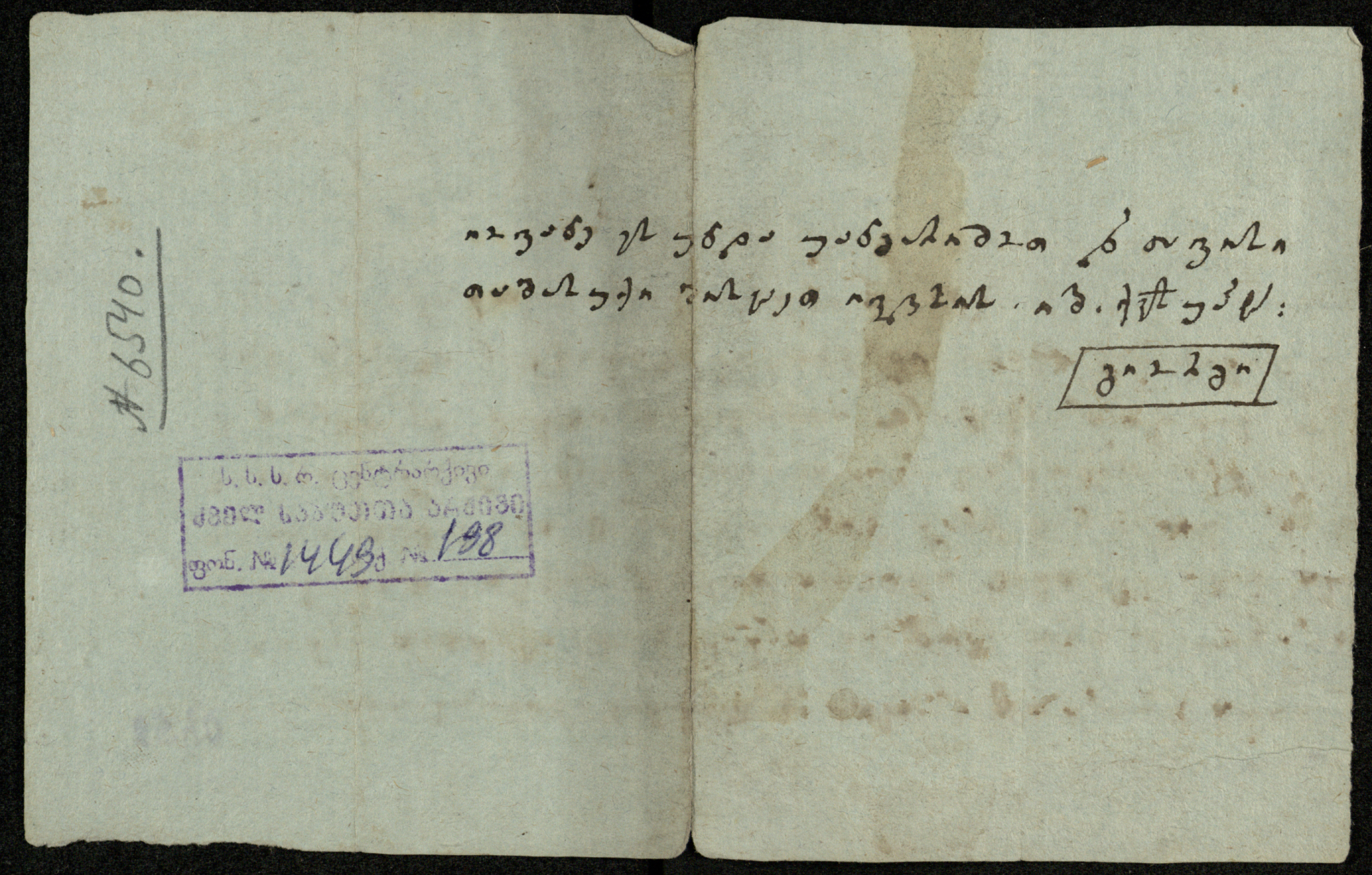 ქაღალდი ცისფერი ჭვირნიშნით და ვერჟერით დაწერილი ყავისფერი მელნით