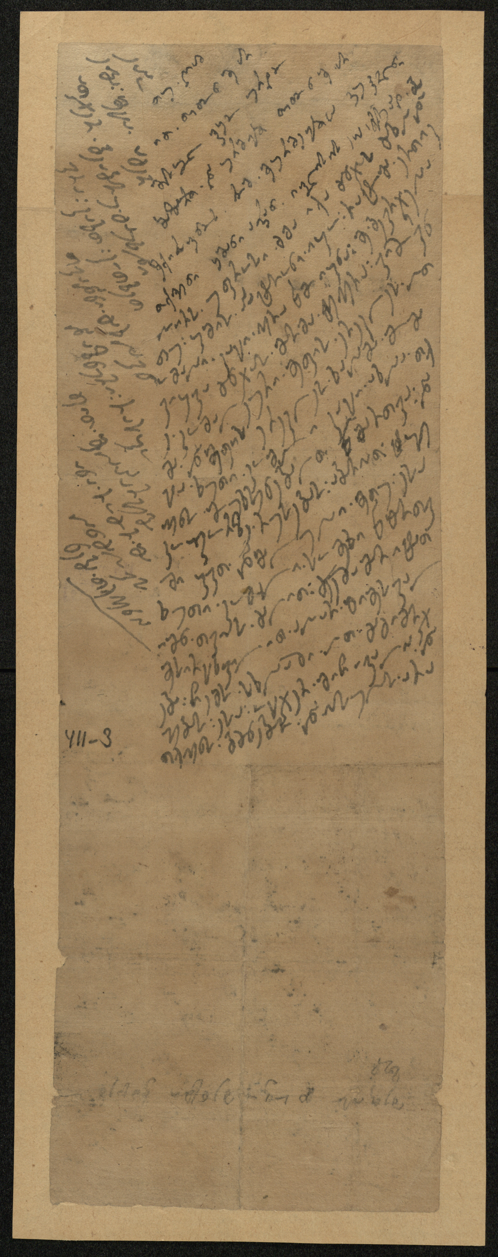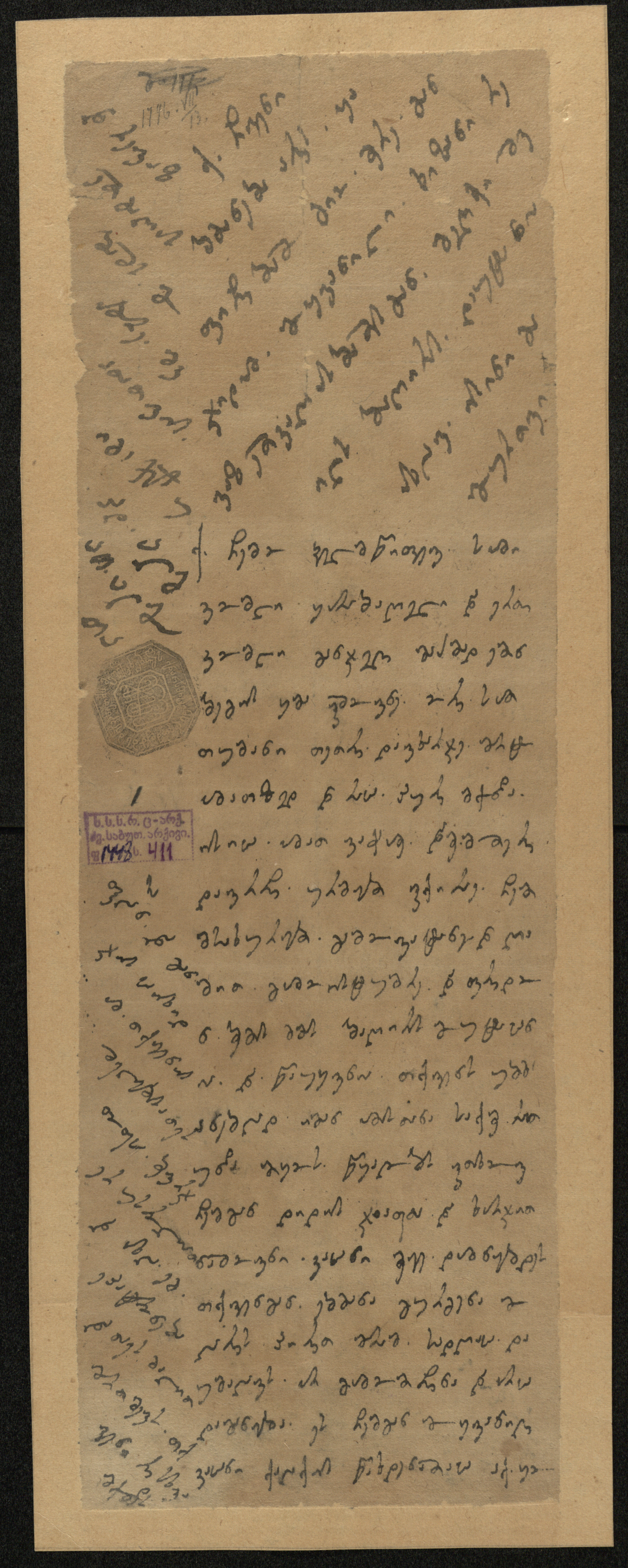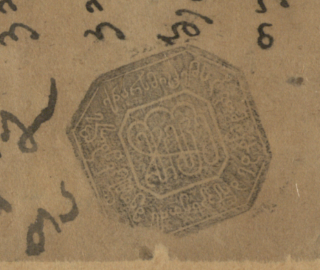 ყავისფერი ქაღალდი ჭვირნიშნით, შესრულებული შავი მელნით