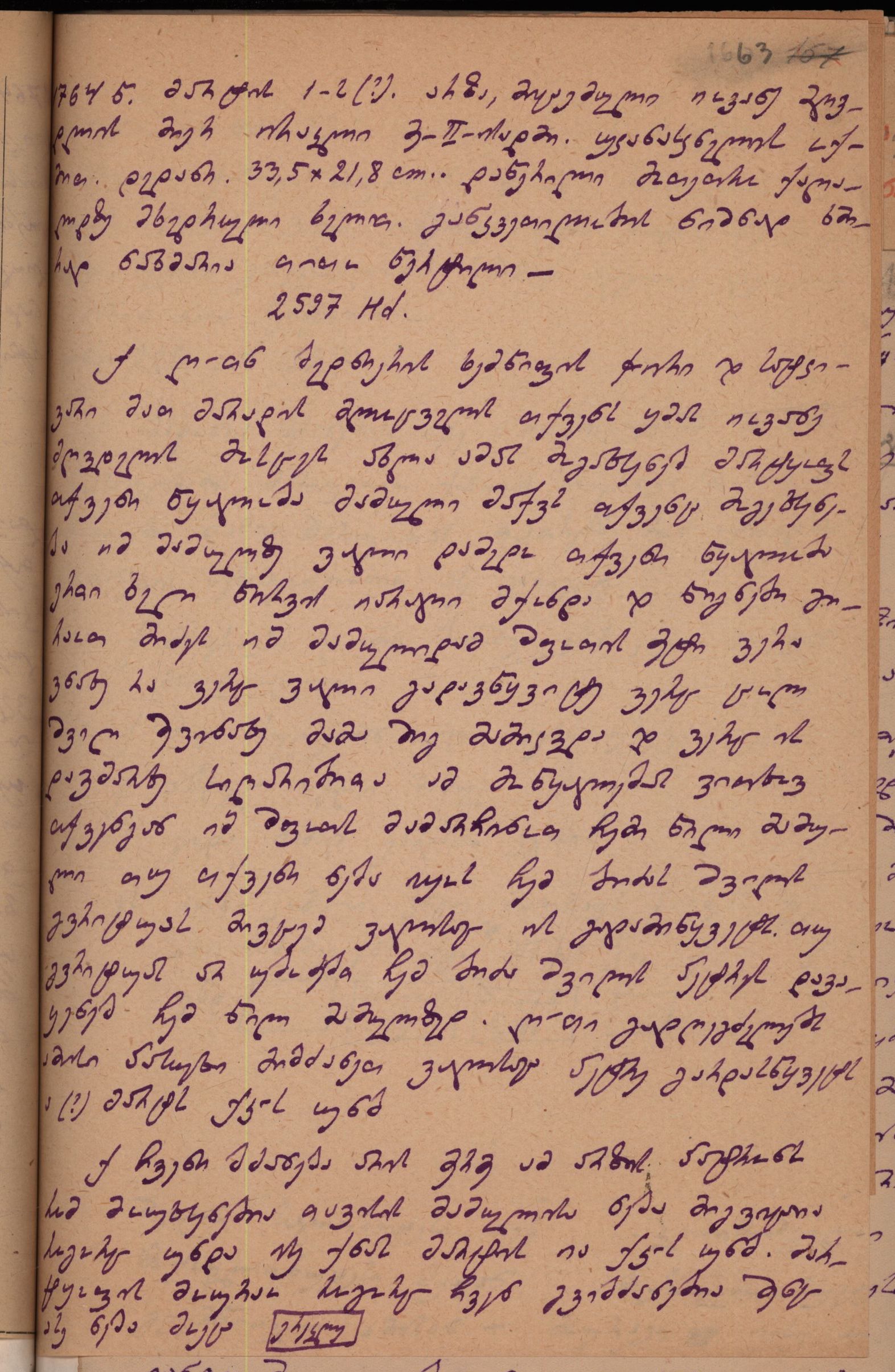 2. დედნის აღწერილობა გიორგი ბოჭორიძის მიერ: ,,დედანი, 33,5X21,8 cm., დაწერილი მოთეთრო ქაღალდზე მხედრული ხელით განკვეთილობის ნიშნად ხშირად თითო წერტილი ნახმარია", დედანი, ხეც, Hd 2597.