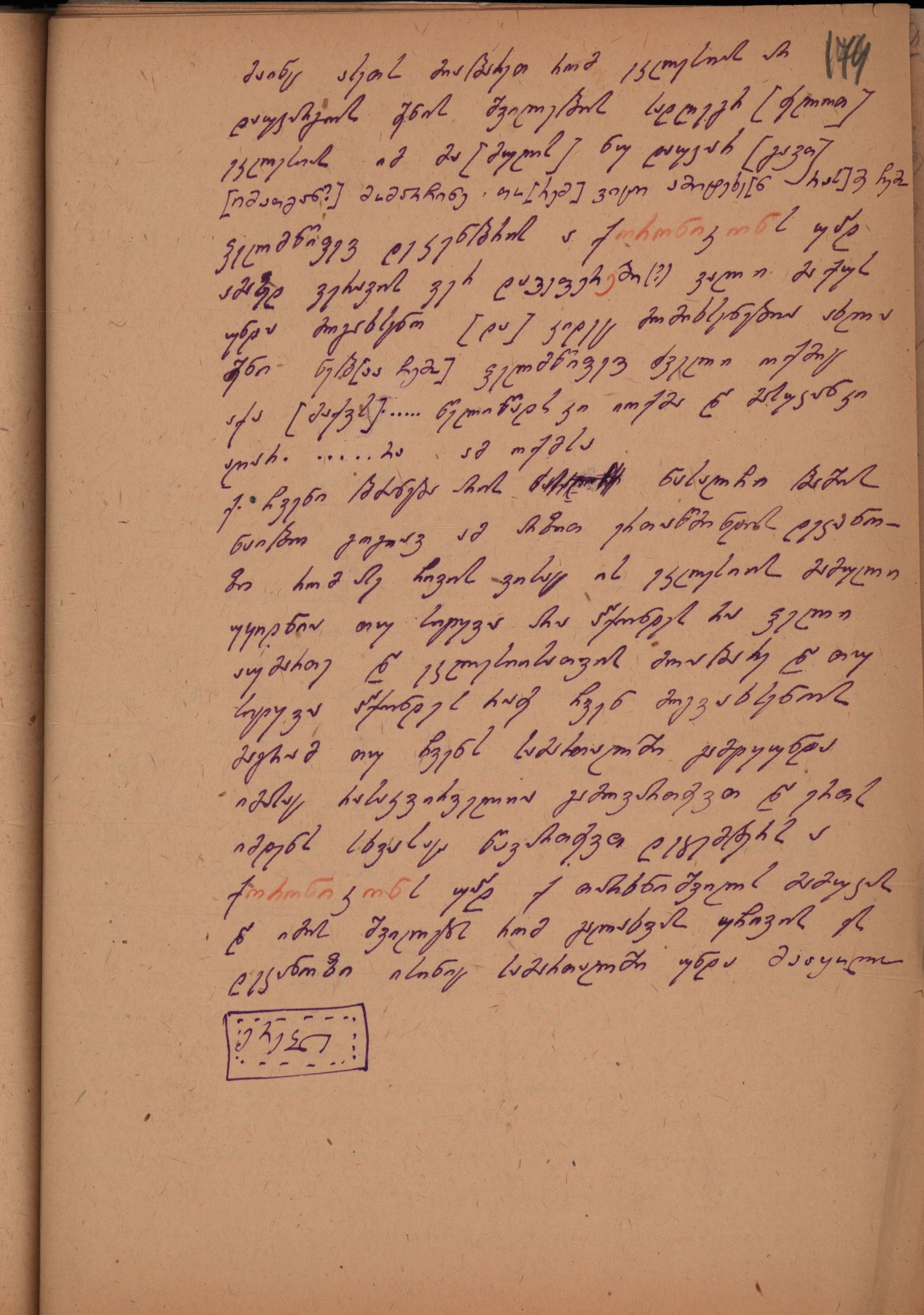 ღია ყავისფერი, დაწერილი ლურჯი მელნით, რამდენიმე სიტყვა შესრულებულია წითელი ფანქრით