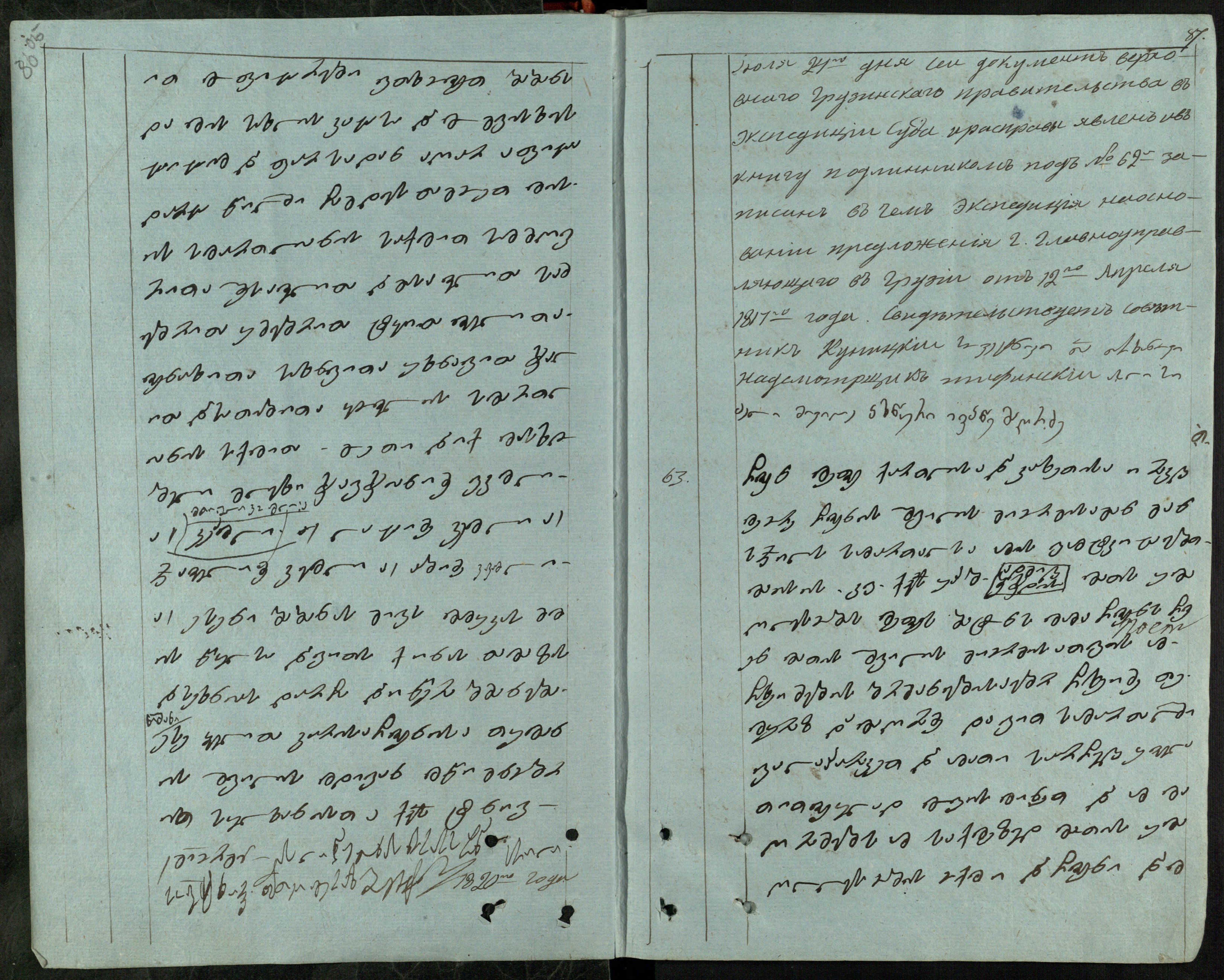 ცისფერი ქაღალდი, დაწერილი შავი მელნით.