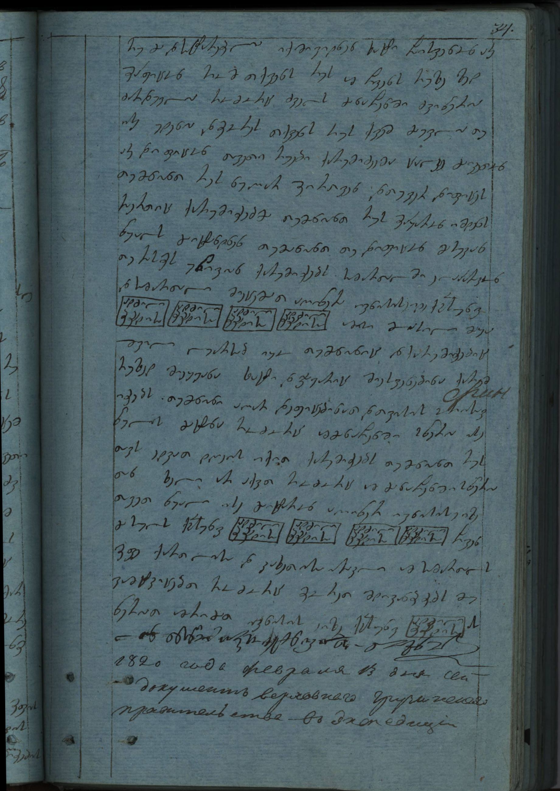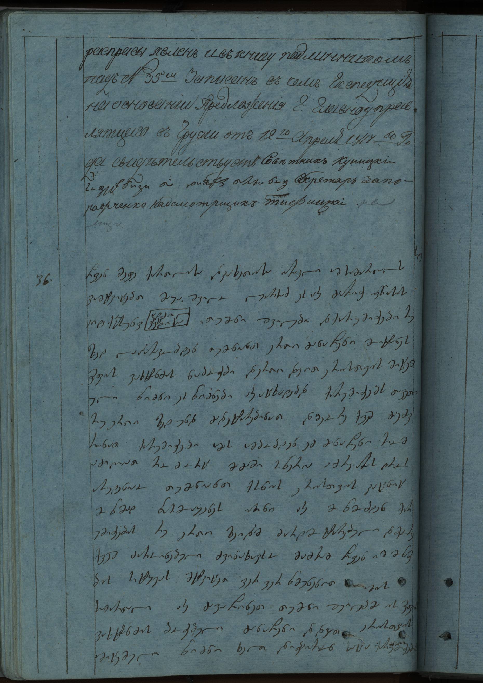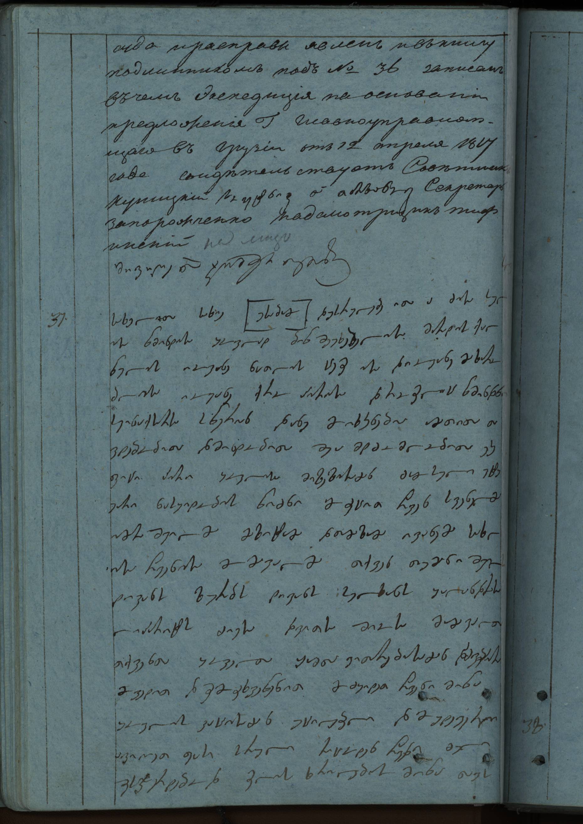 ცისფერი ქაღალდი, დაწერილი შავი მელნით.