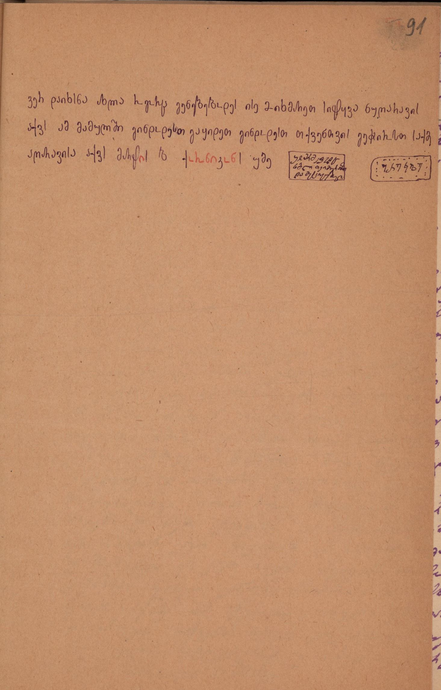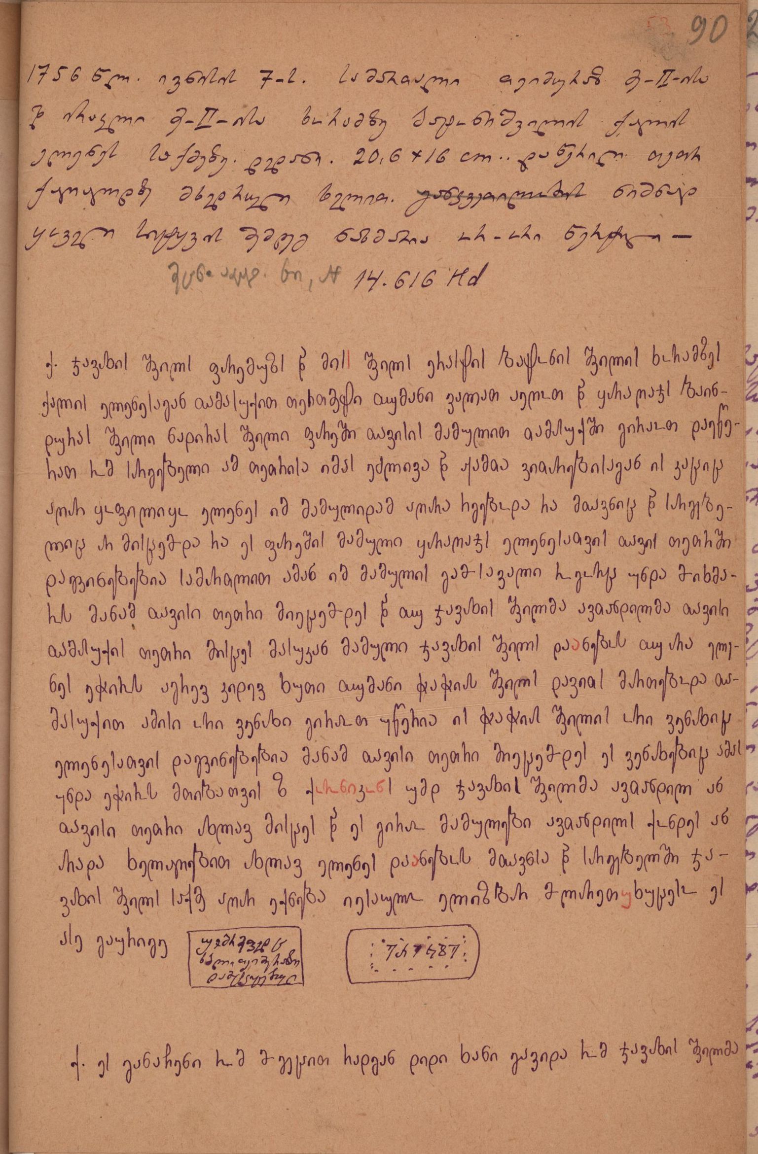 ქაღალდი მოყვითალი, დაწერილი ლურჯი მელნით, რამდენიმე ასო წითელი ფანქრით