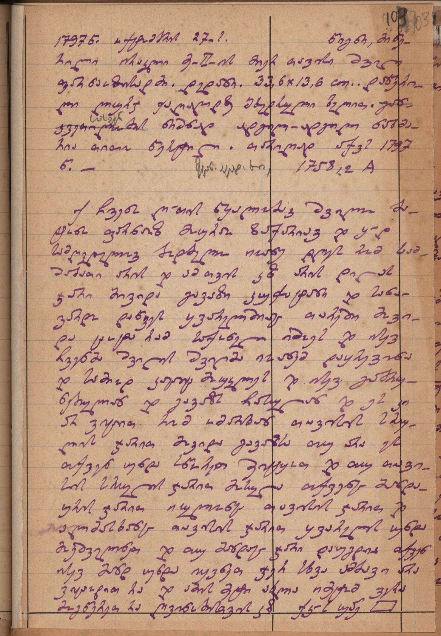 2. დედნის აღწერა გიორგი ბოჭორიძის მიერ: დედანი, 33,6X13 6;დაწერილი ლურჯ ქაღალდზე მხედრული ხელით; განკვეთილობის ნიშნად ადგილ-ადგილ ნახმარია თითო წერტილი".