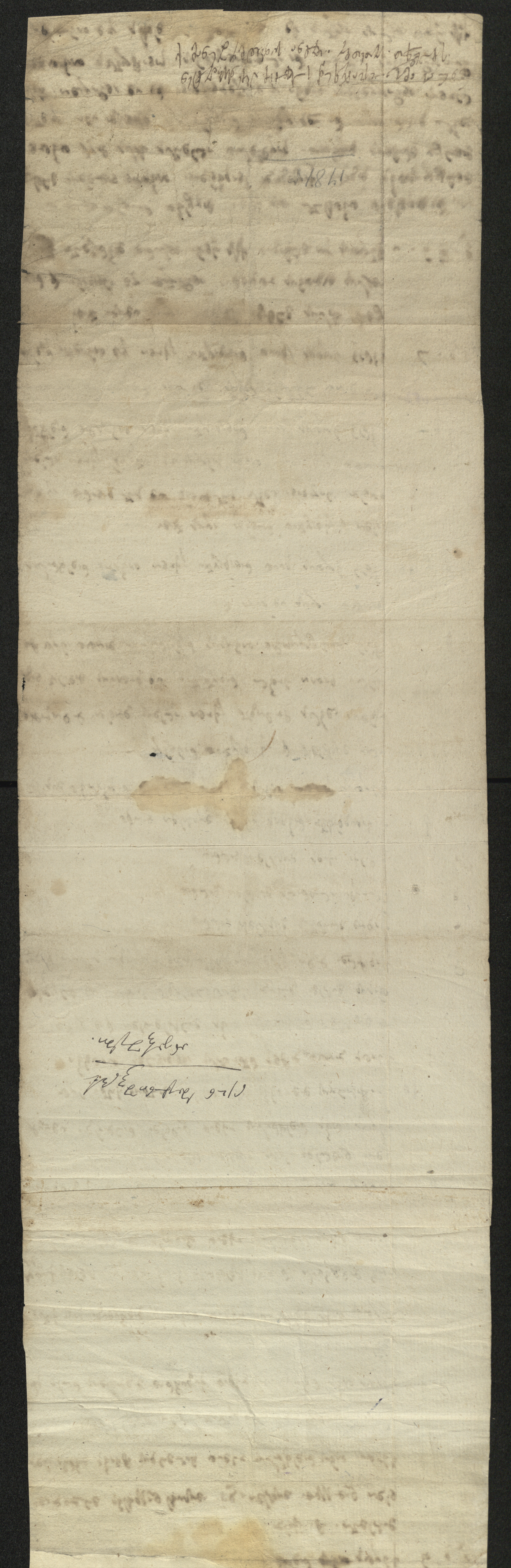 ქაღალდი ნაცრისფერი ყვითელი ლაქებით, დაწერილი შავი მელნით.