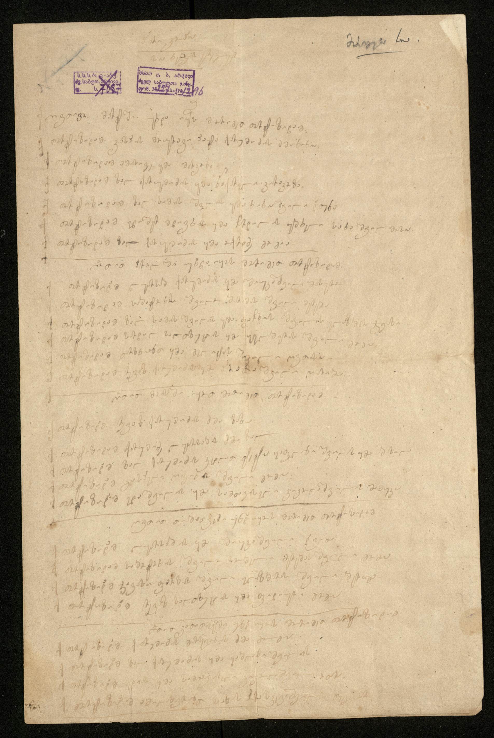 1. გვიანდელი მინაწერები: ა. მორიგეთა სია; ბ. V-ზე ფანქრით: ,,საჭიროა. ისტორია ეტნოგრაფის საზოგადოებას გადაეცეს“.
