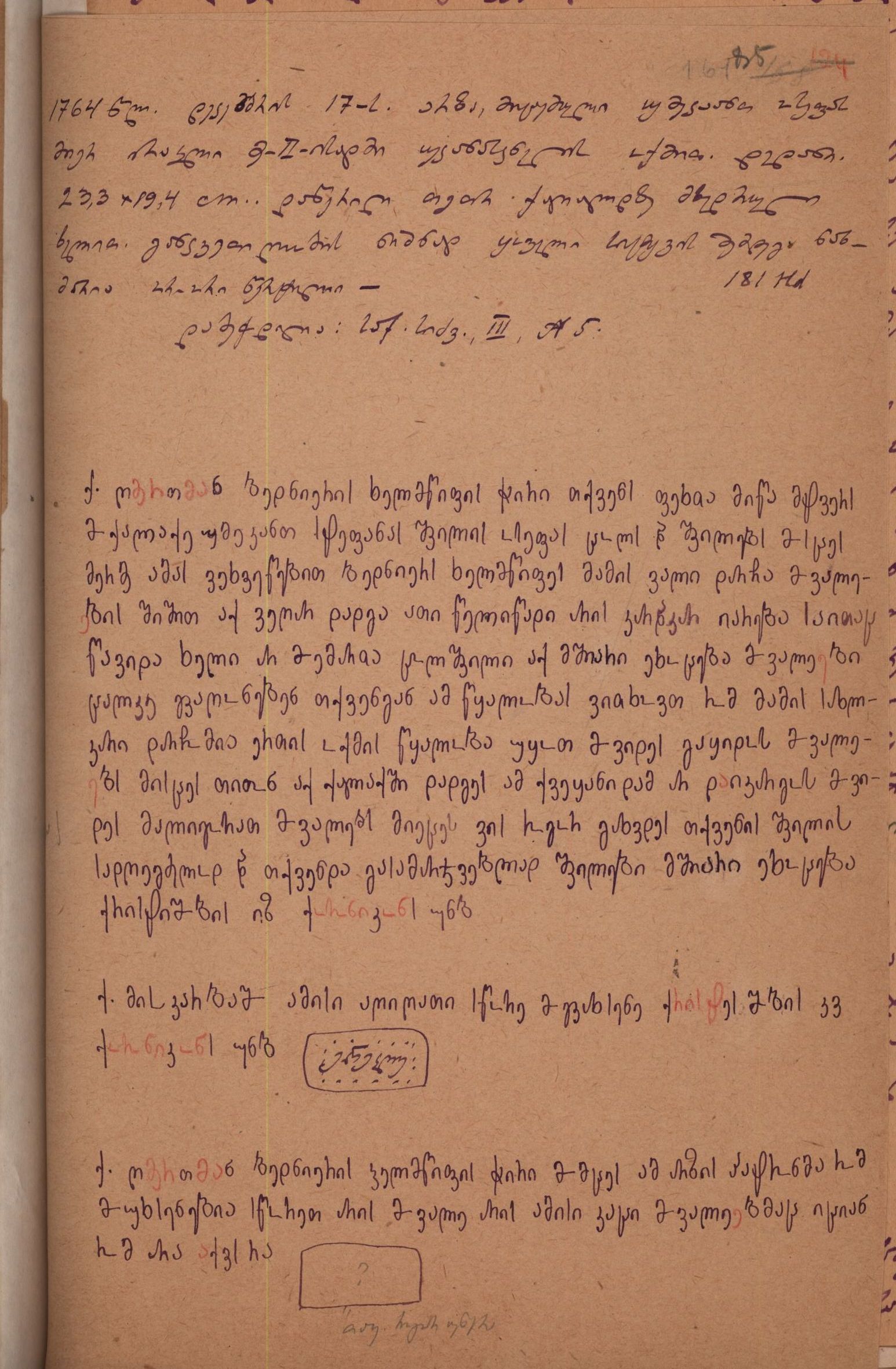 1. ახლავს გვიანდელი მინაწერი: 1765 წ. 22 იანვარი. ბრძანება ერეკლე II-ისა სახლის გაყიდვამდე მევალეების მიერ ოჯახის ხელშეუხებლობის შესახებ.