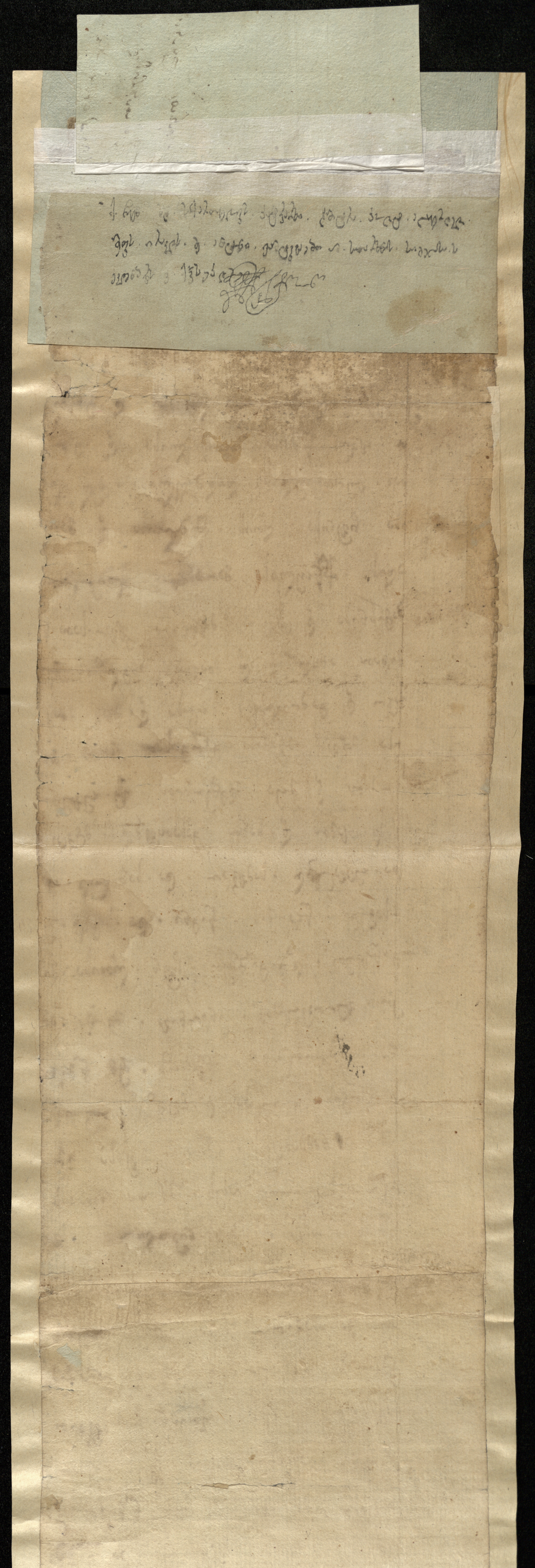 ქაღალდი ღია ყავისფერი და ცისფერი, დაწერილი შავი მელნით.