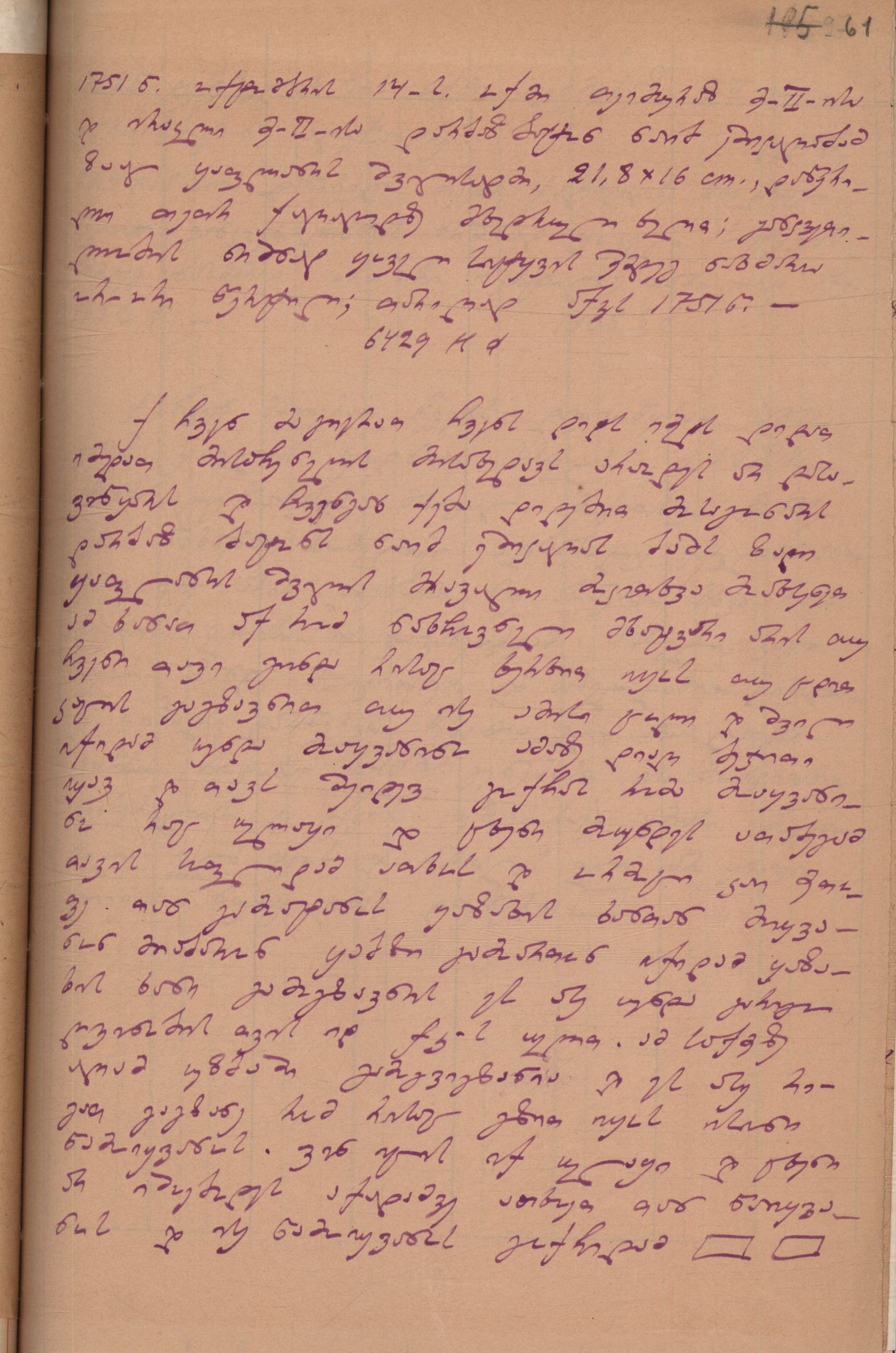 ქაღალდი ღია ყავისფერი, დაწერილი ლურჯი მელნით.
