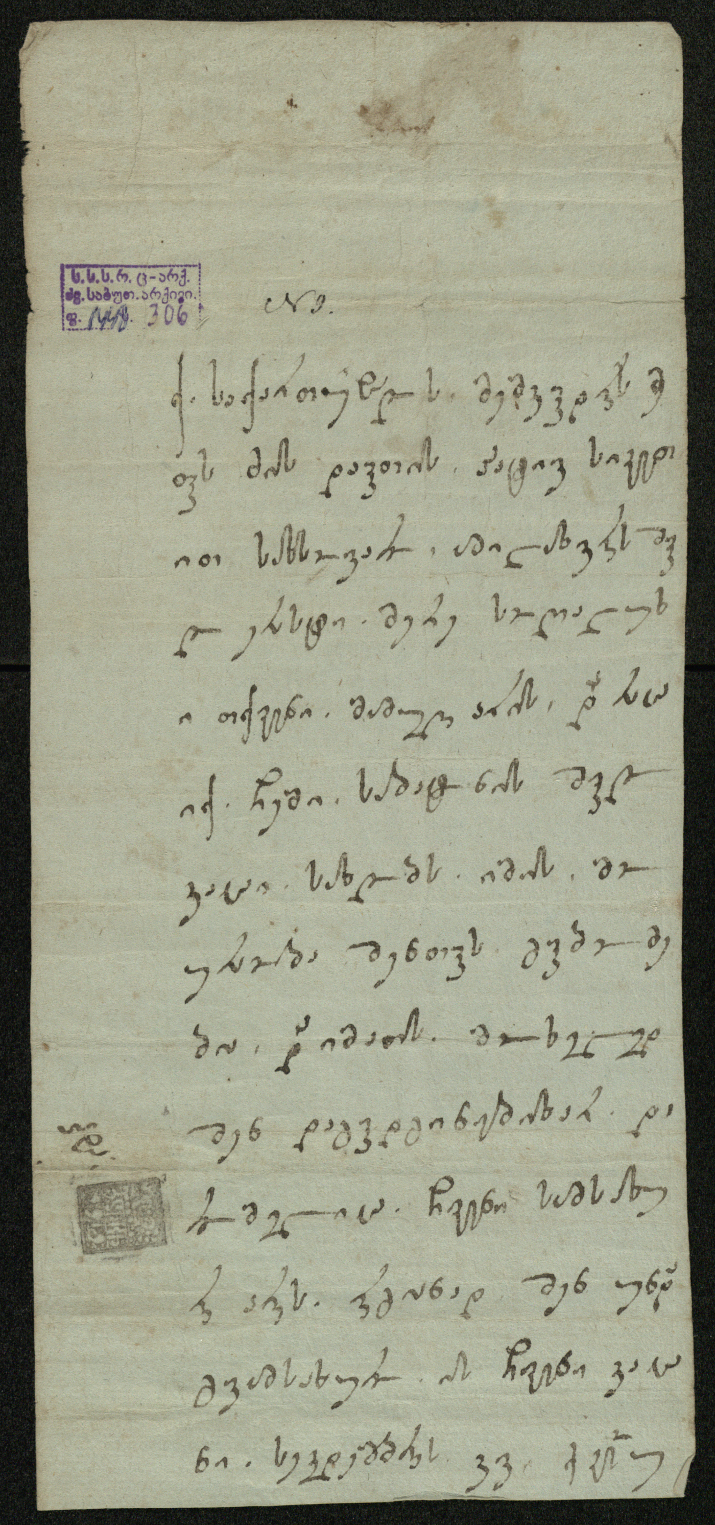 ცისფერი ქაღალდი ჭვირნიშნით, დაწერილი შავი მელნით.